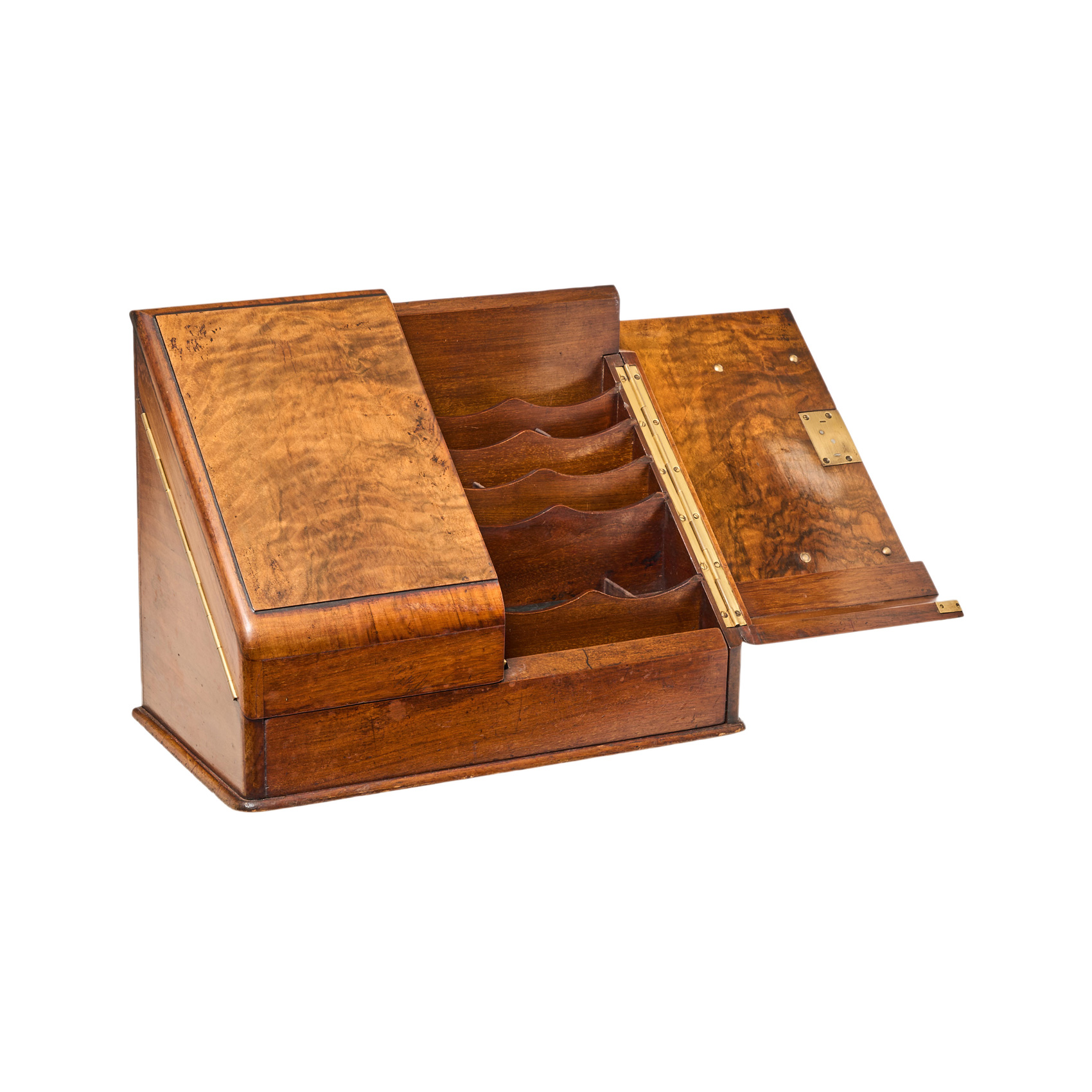 Caja archivador victoriano de viaje en madera de nogal, fles. del s.XIX. Frente batiente con interior compartimentado, un tintero en cristal y un cajón inferior. Adjunta llave.