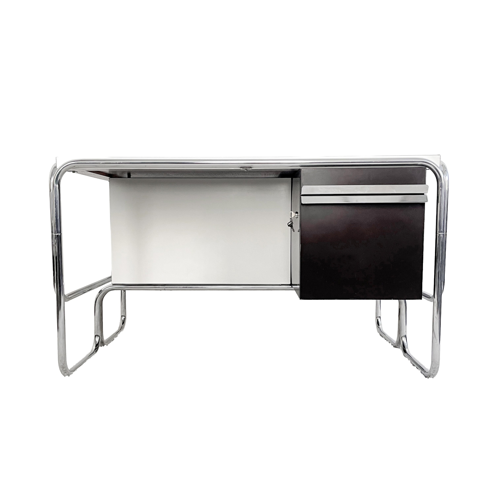 Escritorio de estilo Bauhaus en estructura tubular de acero cromado, c.1970. Cajonera metálica lateral marrón con archivador y llave de cierre. Sobre y separadores en madera laminada tonalidad blanca.