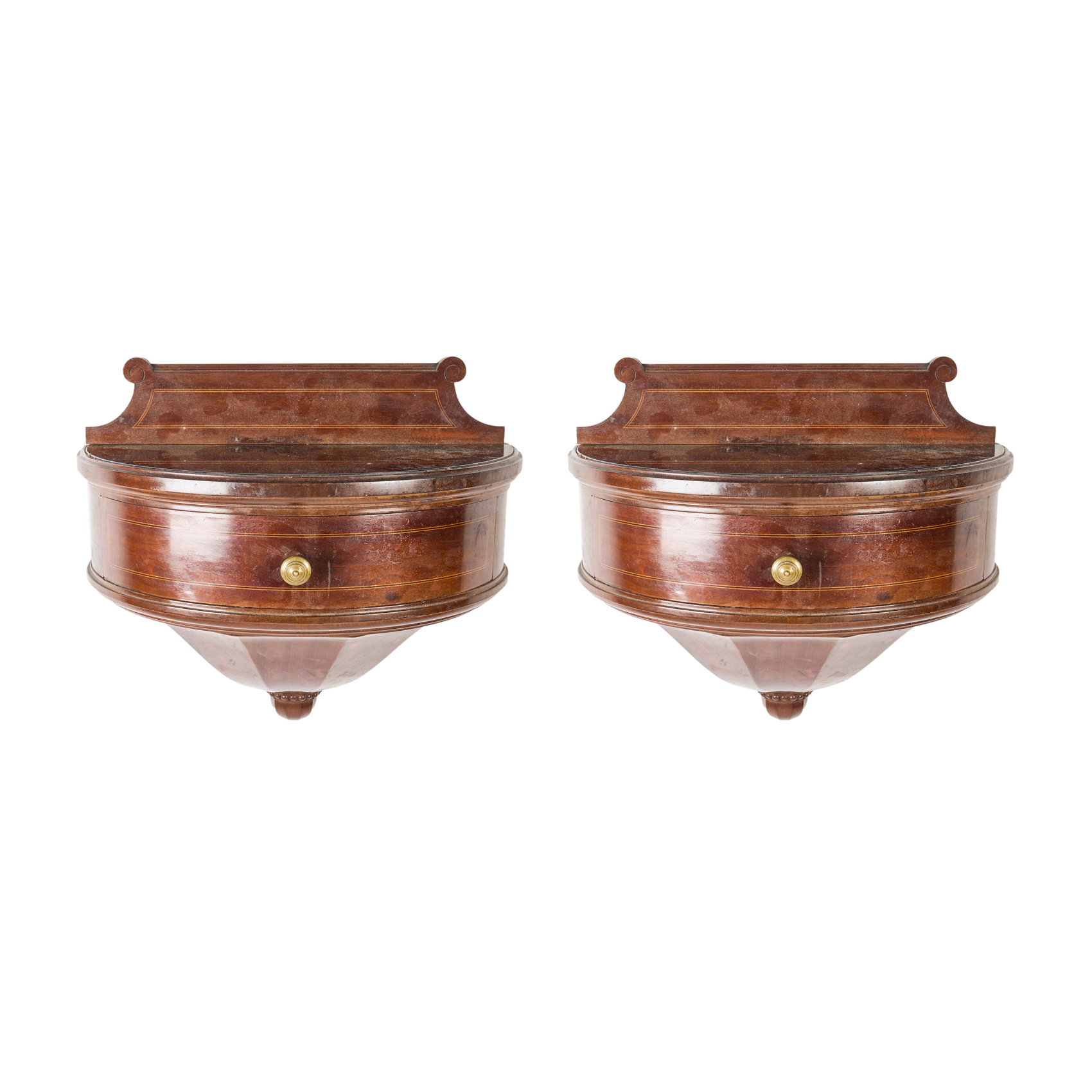 Pareja de mesitas de noche en forma de ménsula en madera de caoba con fileteado en limoncillo y cajón en cintura, s.XX.