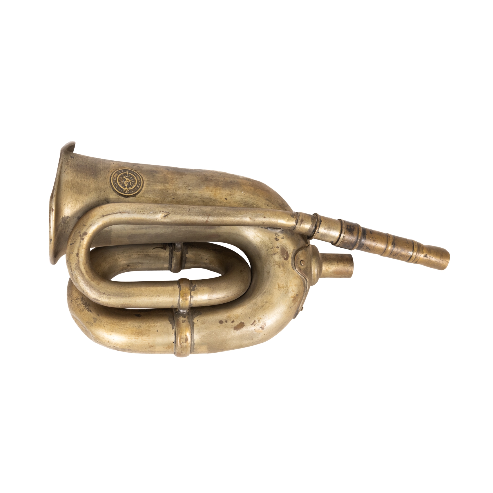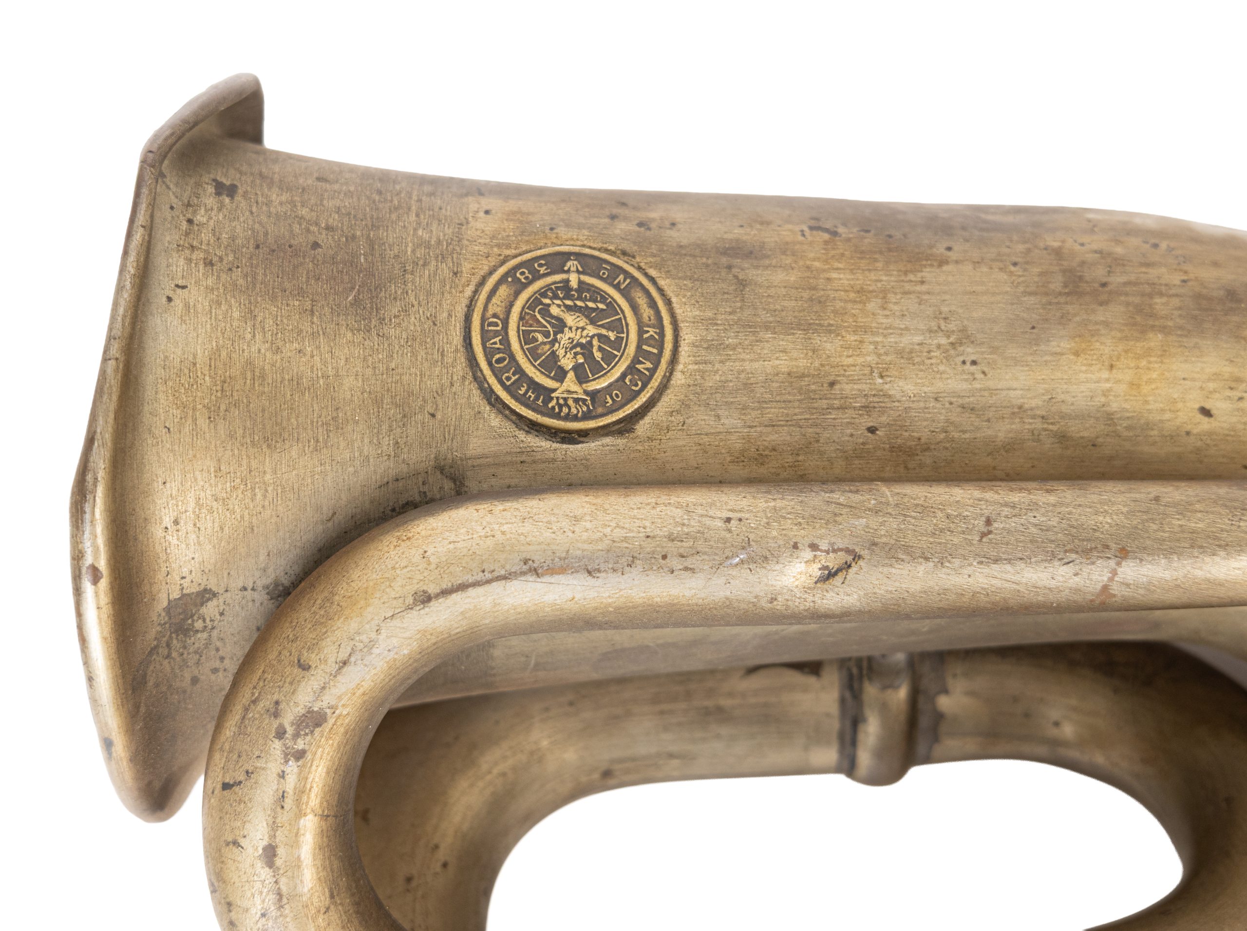 Antigua bocina inglesa en latón con sello de la manufactura King of the Road, Birmingham, Inglaterra, ppios. del s.XX.
