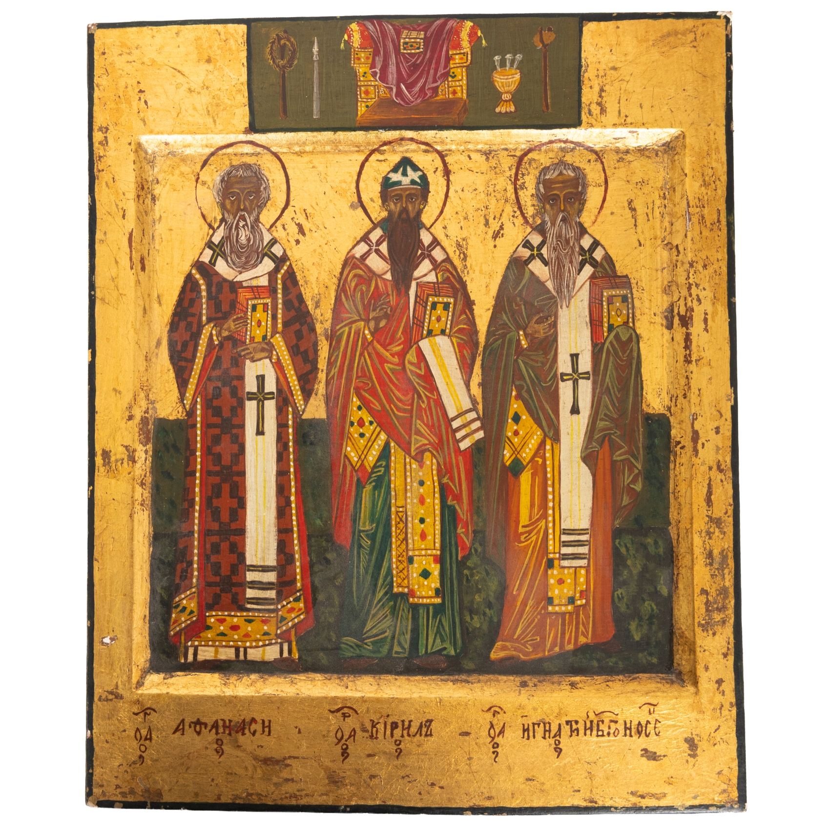 Icono ruso en madera pintada y sobredorada con representación de Atanasio el Grande, Cirilo de Alejandría e Ignacio de Antioquía, primera mitad del s.XX.
