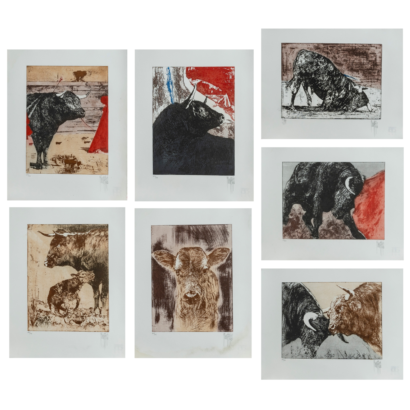 Libro estuche de los siete grabados al aguafuerte sobre papel. Firmados y numerados 24/75 a lápiz. Para ilustrar los escritos de los toreros Matias Prats, Paco Camino, Antonio Borrero, Joselito, Espartaco, Litri, Ganadero y Cristina Sánchez, firmados a lápiz.