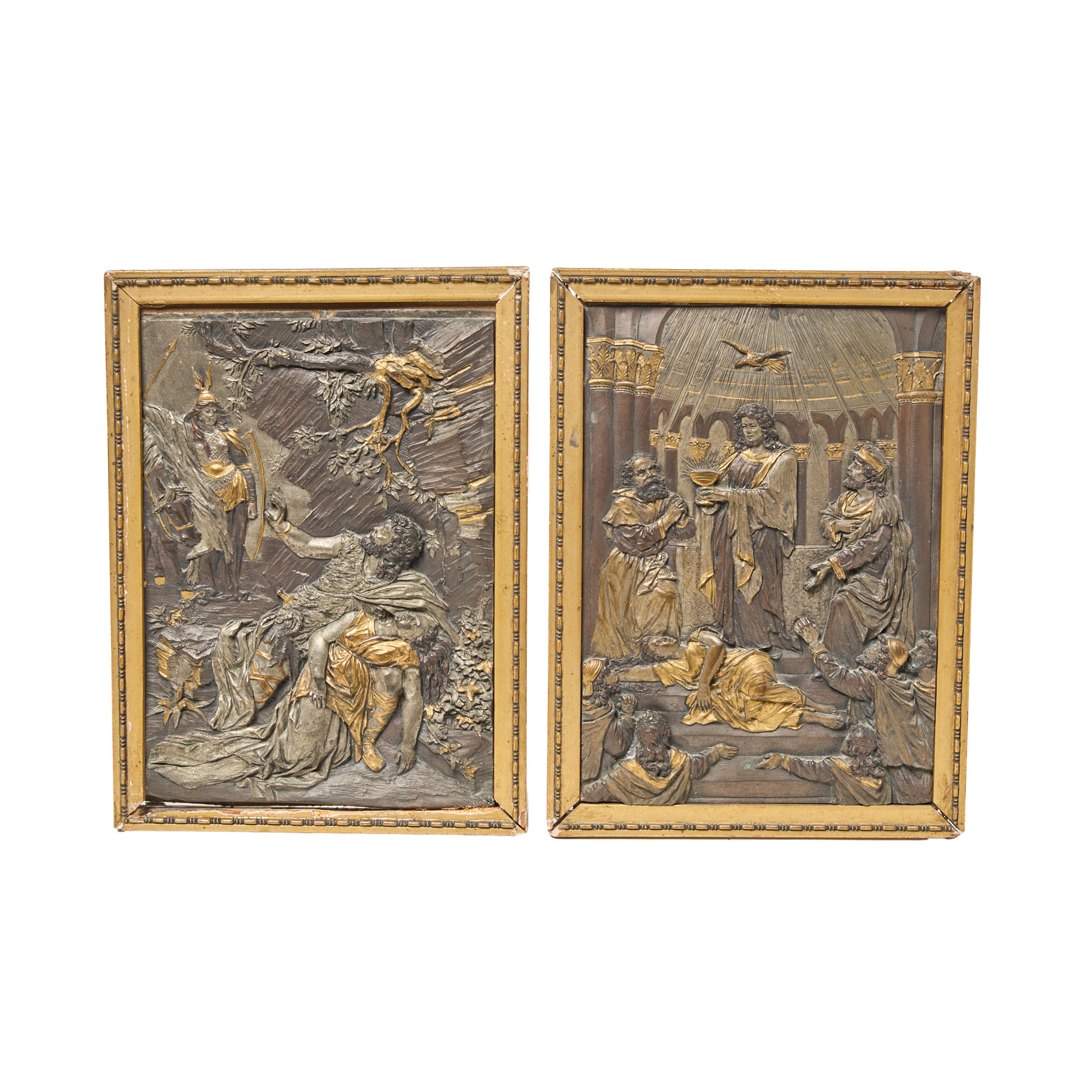 Pareja de relieves en metal parcialmente dorado con escena de Jesús en el Templo y de Brunilda descubriendo a Sigmundo y Siglinda, fles. del s.XIX -ppios. del s.XX.