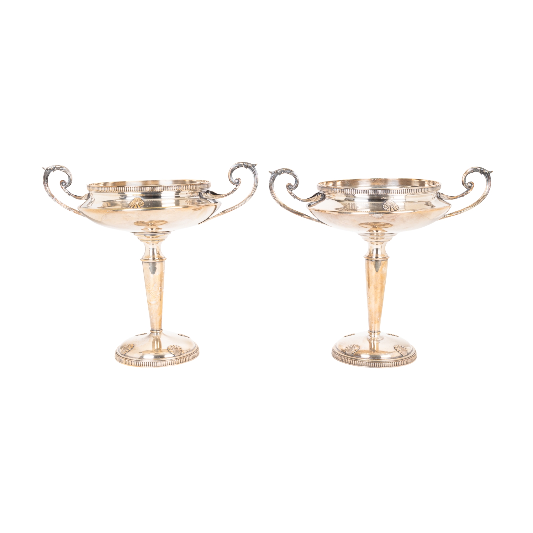 Pareja de centros diseño copa en metal plateado con decoraciones de cenefas, roleos y veneras, c.1930.