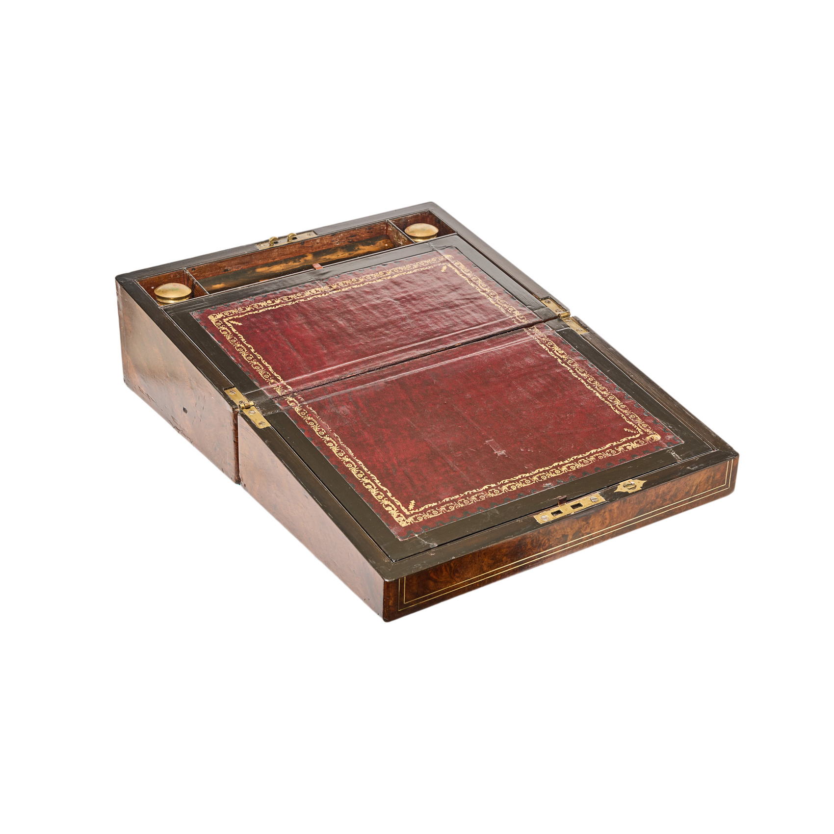 Escribanía victoriana de viaje en madera de raíz y ébano con escudo y fileteados en latón, fles. del s.XIX. Interior compartimentado con dos tinteros en cristal. Sobre en cuero burdeos. Sin llave.