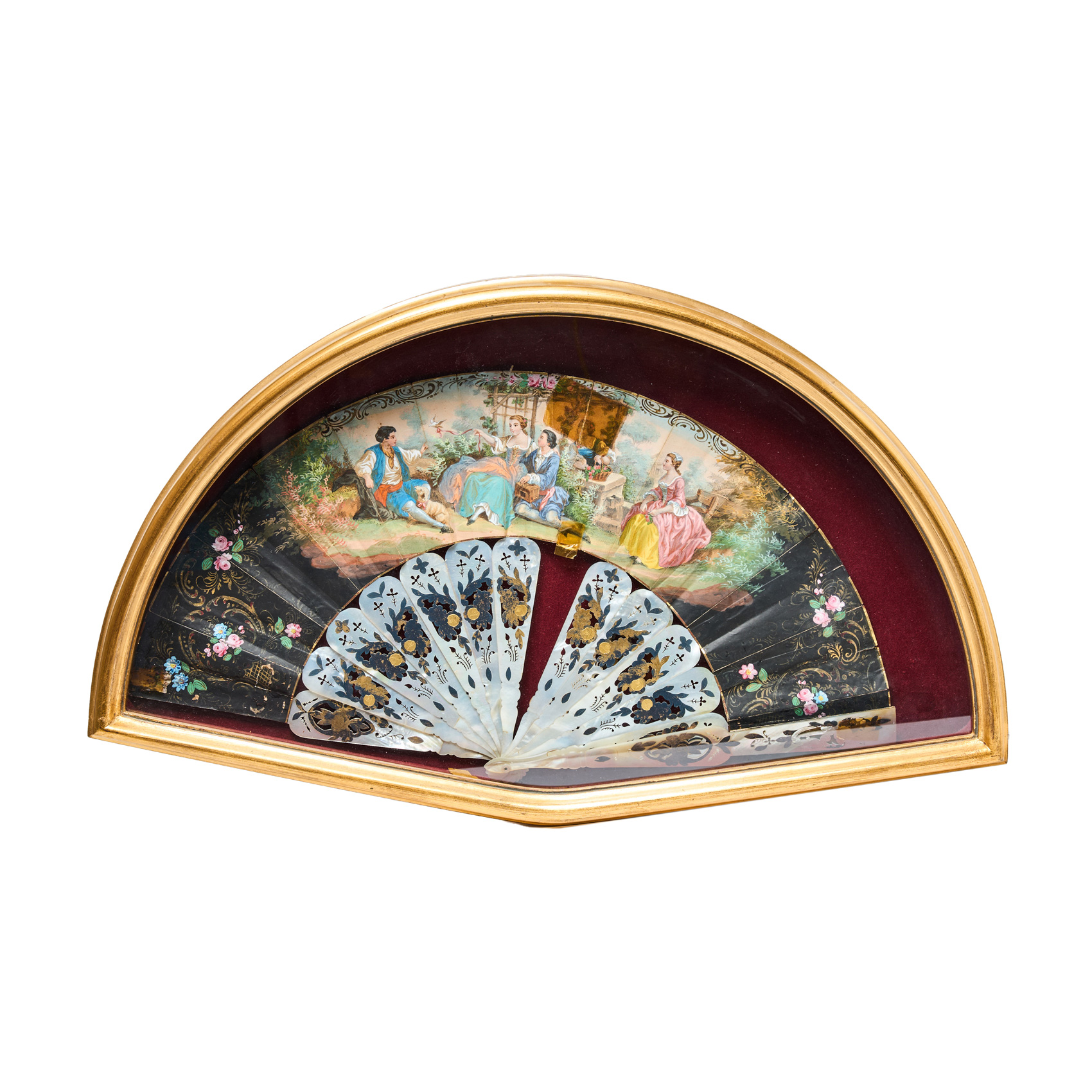 Abaniquera con abanico isabelino, s.XIX. Varillaje en nácar calado con motivos florales dorados y guardas a juego con clavijo en nácar. País litografiado con escena galante en anverso.
