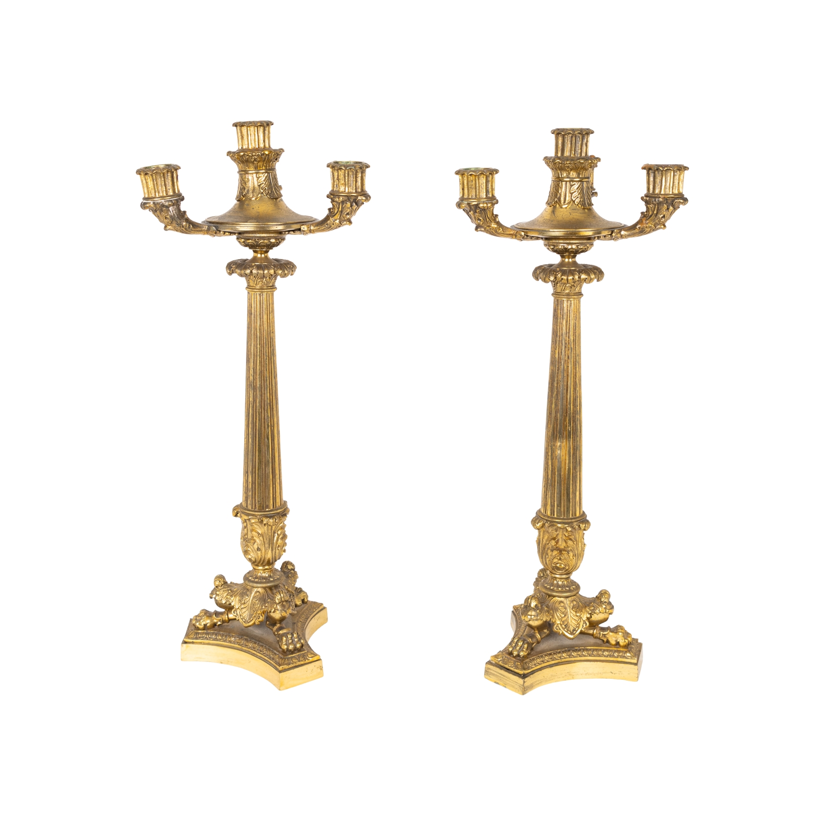 Pareja de candelabros de cuatro luces período Restauración Carlos X en bronce dorado con decoración estriada, de roleos, rocallas y patas en garra, s.XIX.