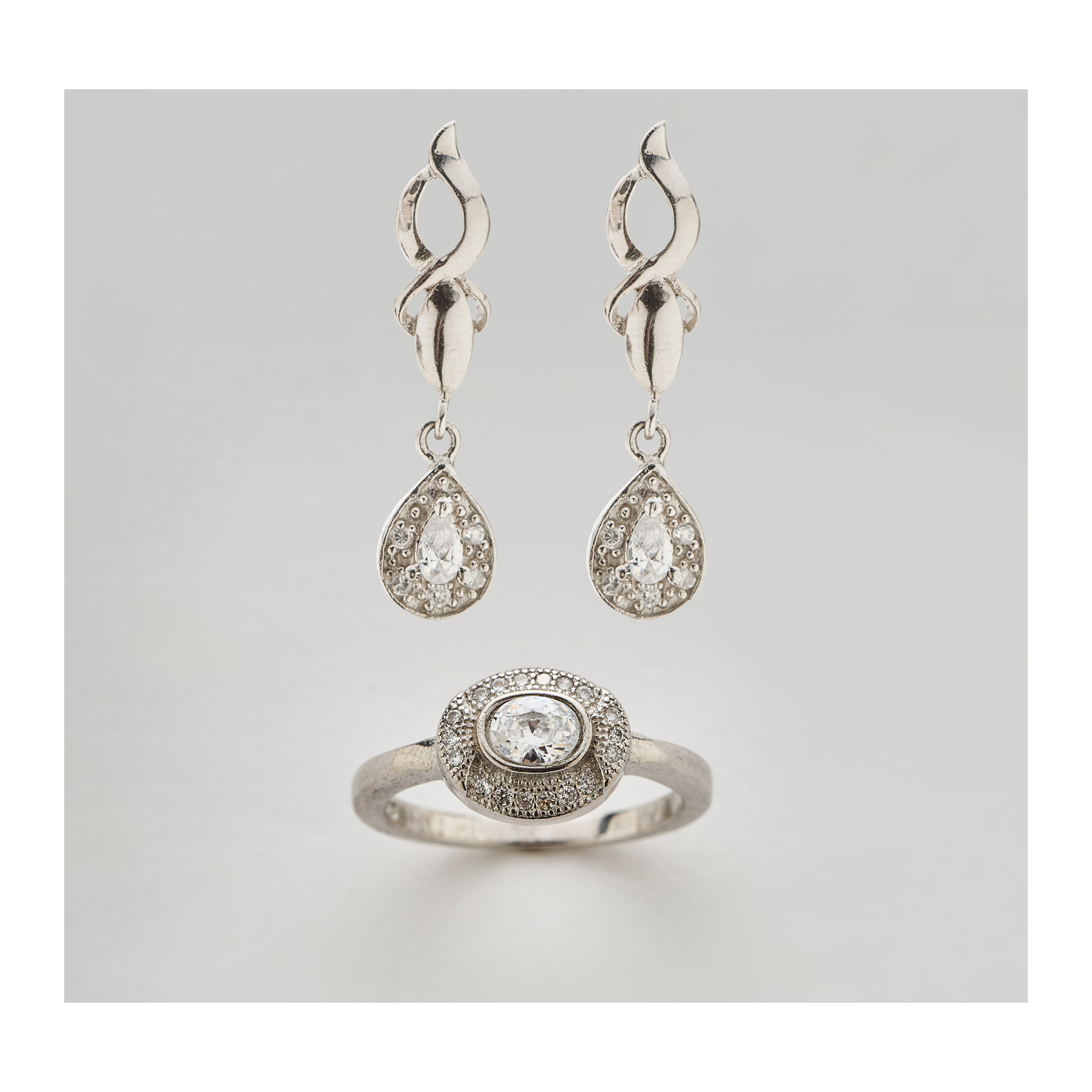 Pendientes largos y sortija en plata con circonitas tallas redonda y perilla.