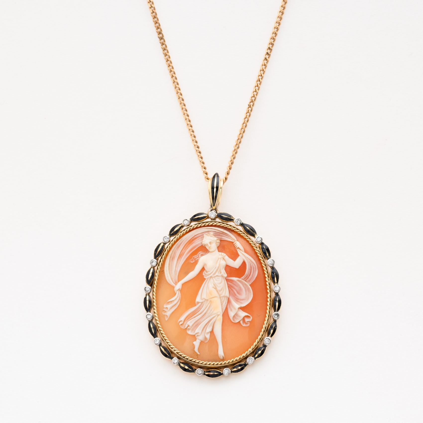 Cadena y colgante en oro con camafeo representando figura femenina, orla de cordoncillo y decorado con motivos ojivales de esmalte negro y diamantes talla 8/8 engastados en chatón, 5,5 x 3,5 cm.