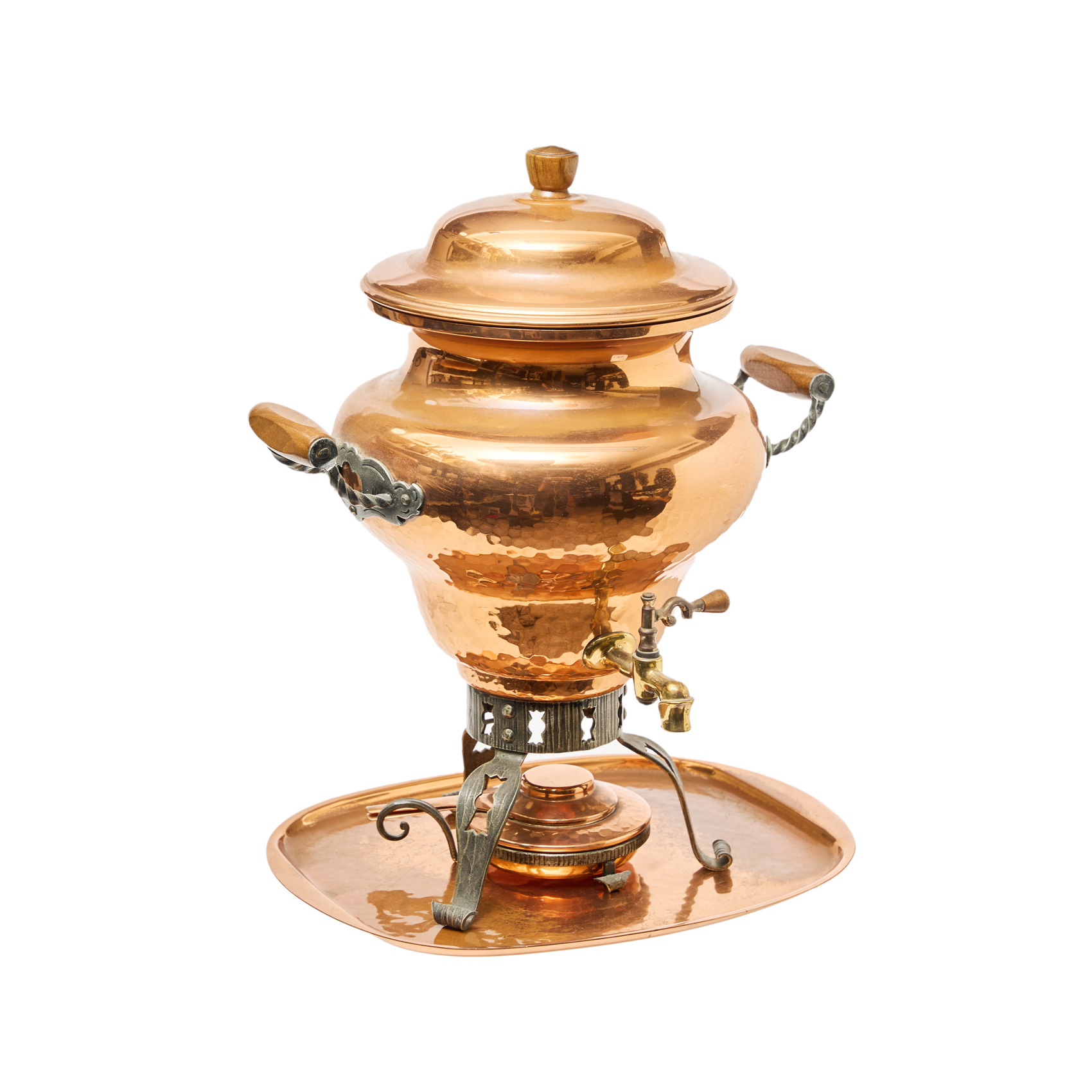 Samovar suizo con bandeja en cobre con decoración de motivos lisos y martelé, s.XX. Pie y asas en metal con empuñaduras en madera.