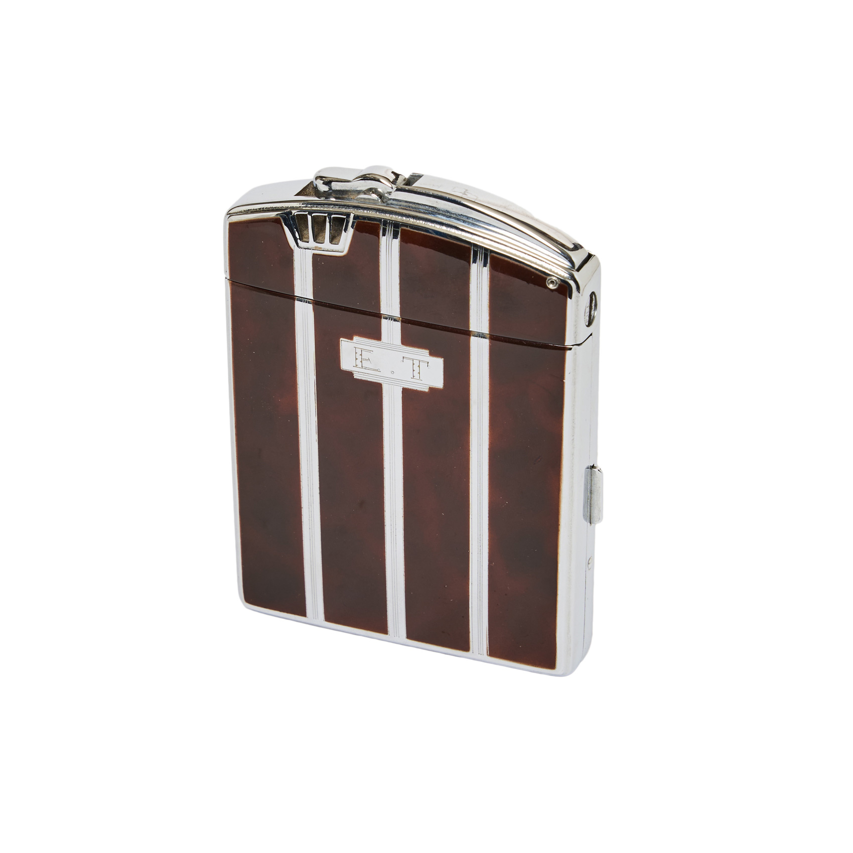 Mechero-pitillera de la firma americana Ronson Consumer Products Corporation (world’s greatest lighter) en metal plateado esmaltado en símil carey, segunda mitad del s.XX. Adjunta caja original.