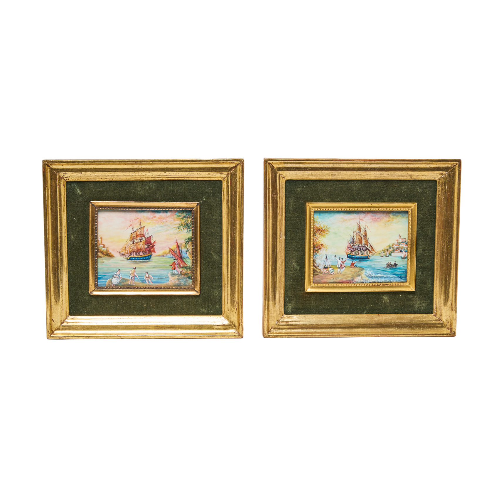 Pareja de miniaturas pintadas al gouache sobre placas en hueso con representación de escenas navales, s.XX. Firmadas J. Canova.