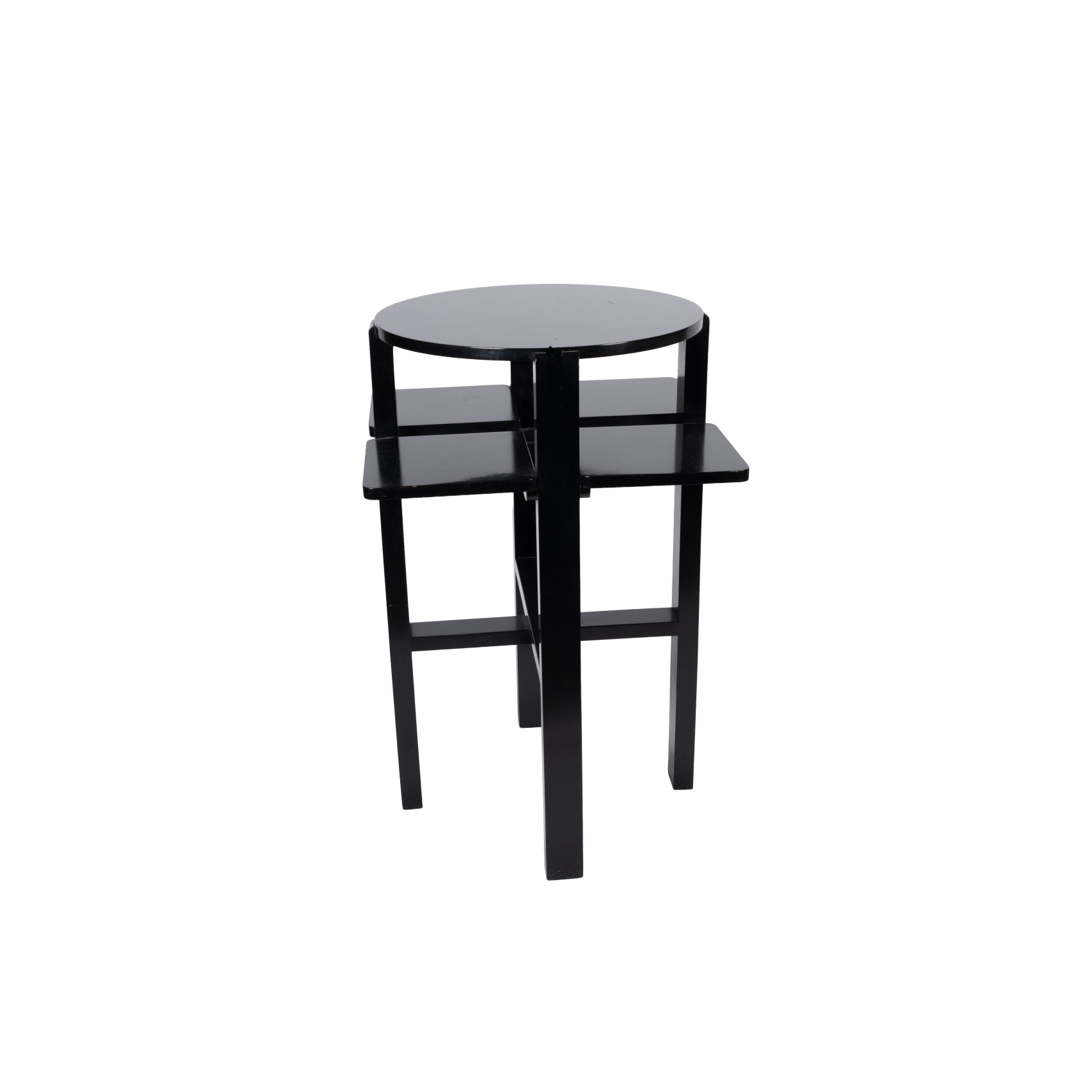 Mesa modelo «Dominó» en madera de roble lacada en negro con sobre superior circular y cuatro baldas inferiores cuadrangulares. Reedición posterior.