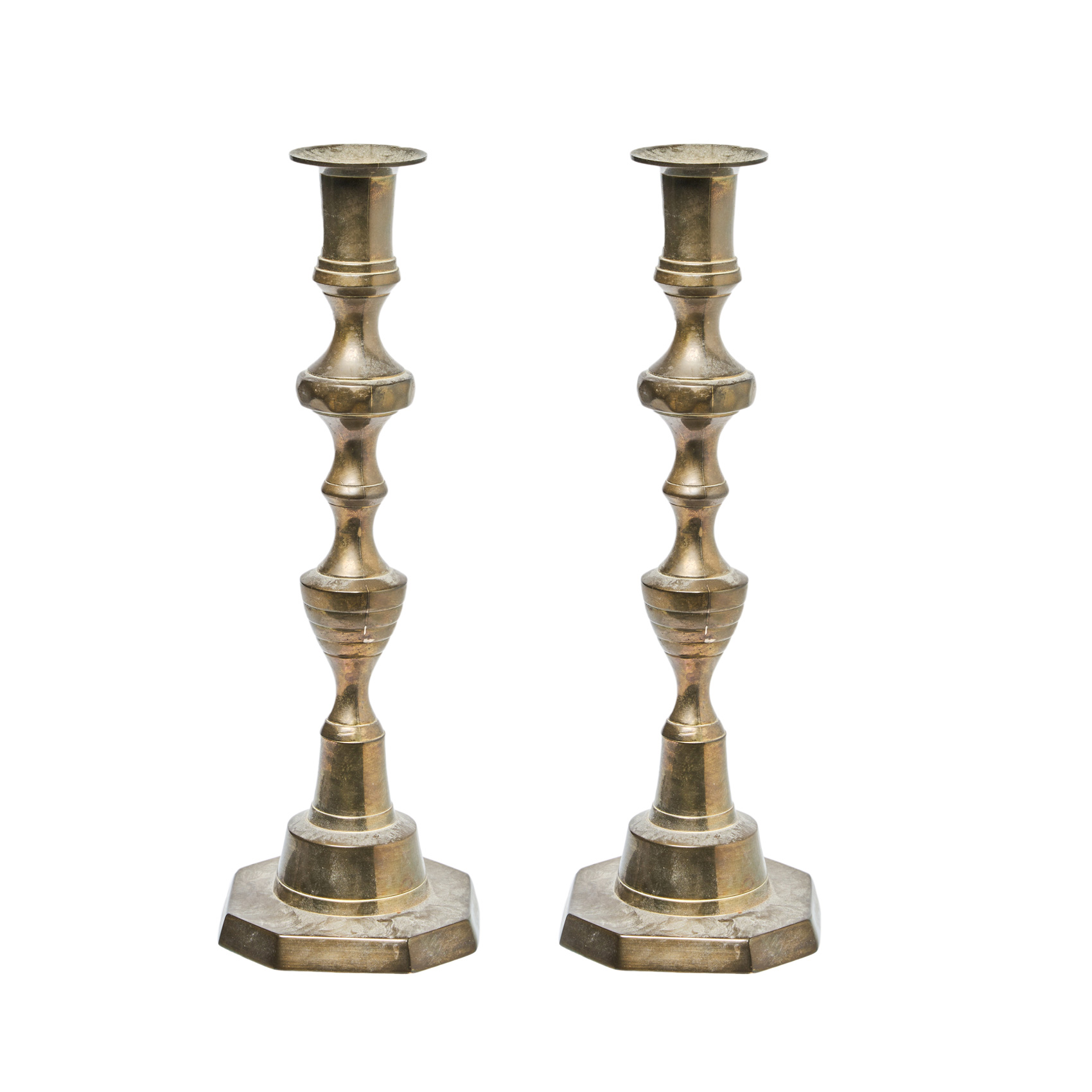 Pareja de candeleros en bronce dorado con decoración de líneas lisas, s.XX.