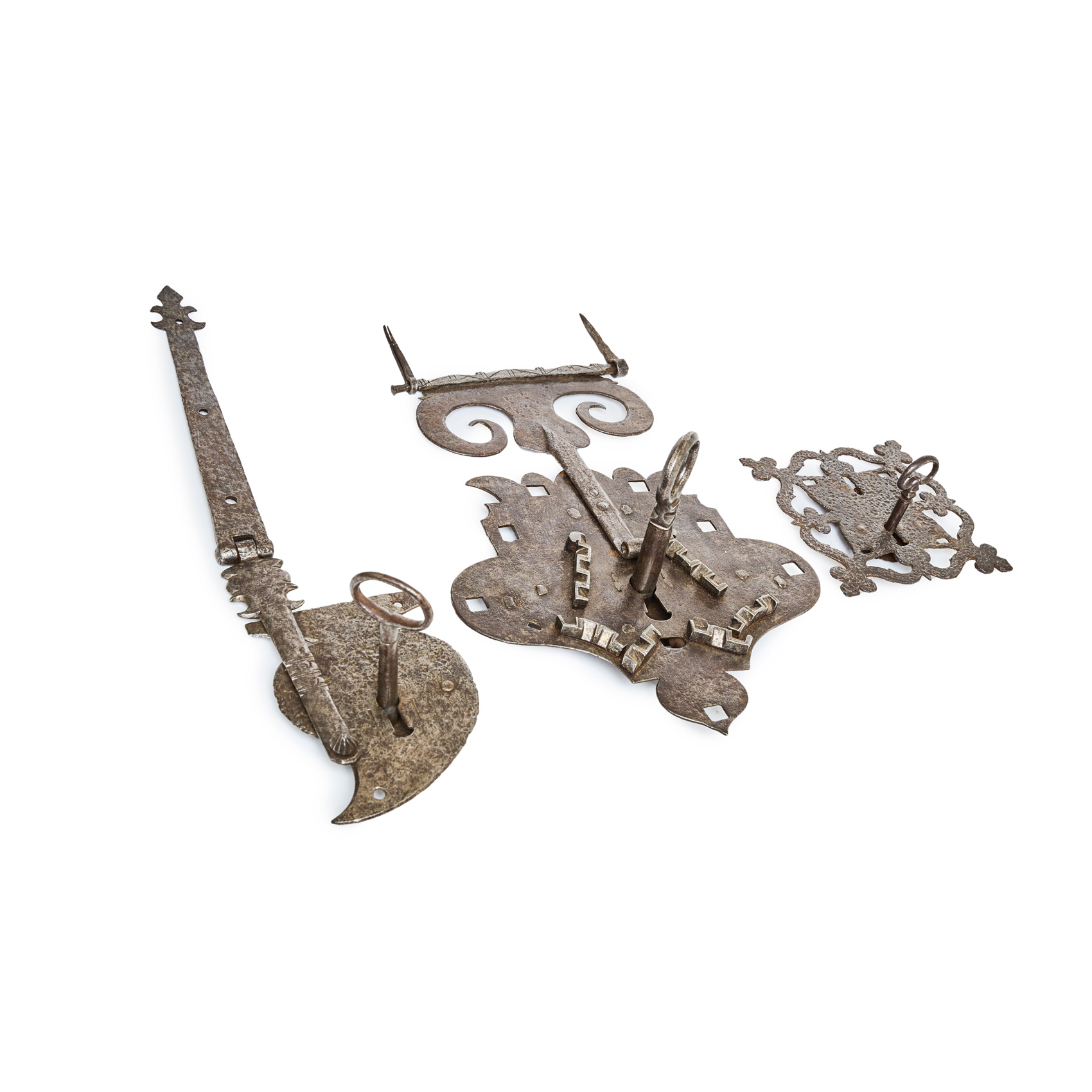 Lote de tres cerraduras en hierro forjado probablemente de baules o arcones, s.XVIII. Adjuntan las llaves.