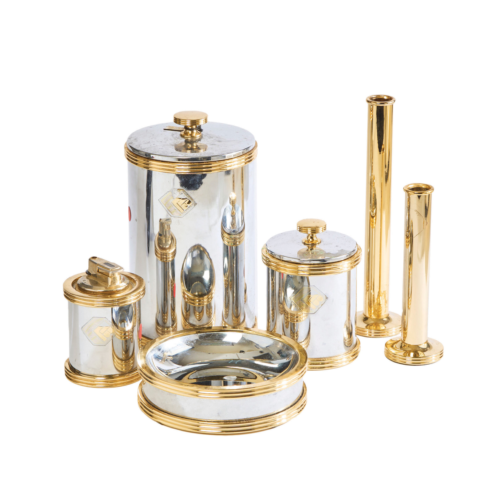 Juego de fumador y dos candeleros en metal plateado y dorado con decoración de líneas lisas, s.XX.