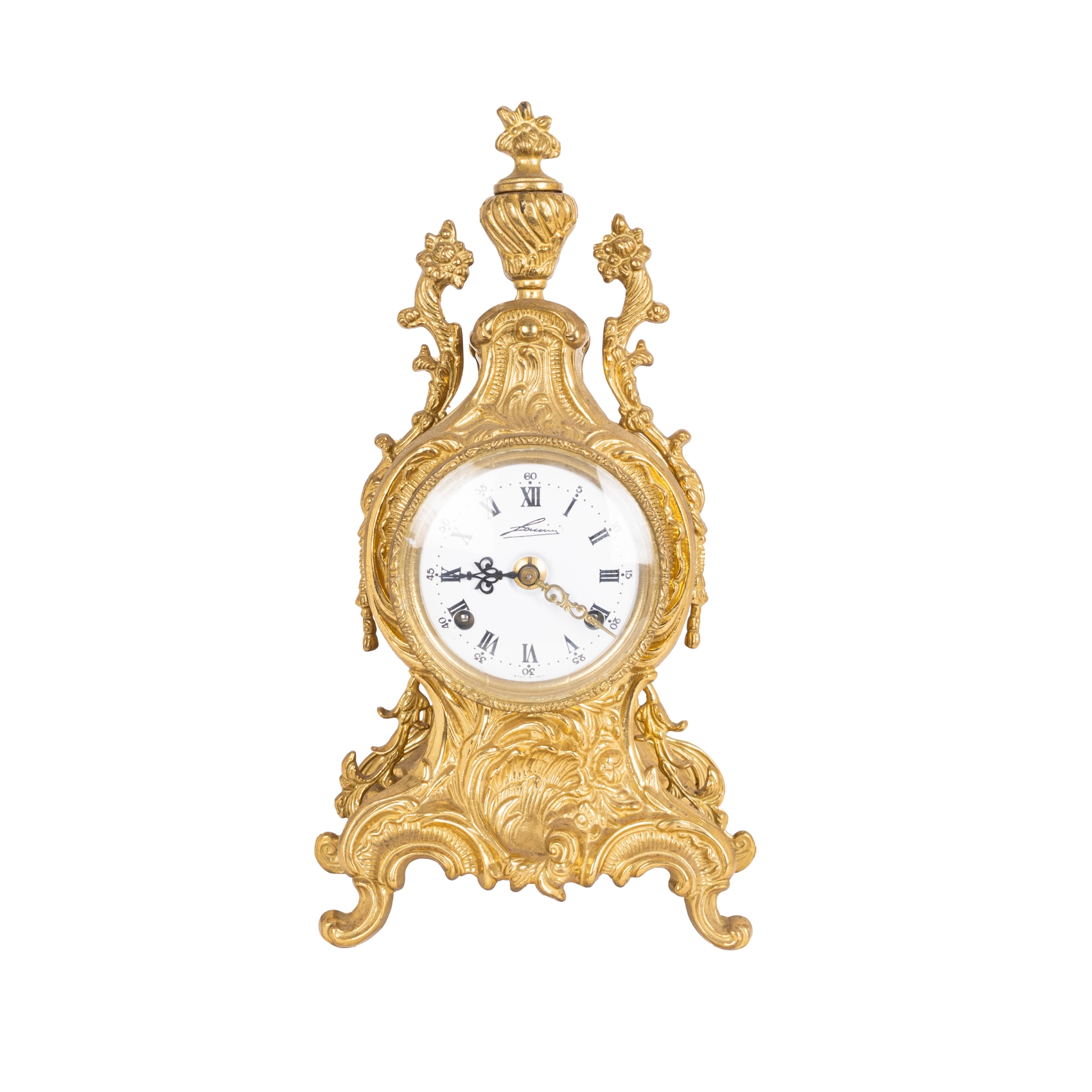 Reloj de sobremesa francés estilo Luis XV en bronce dorado, s.XX. Esfera con numeración romana. Maquinaria París con sonería de horas y medias. Adjunta llave.