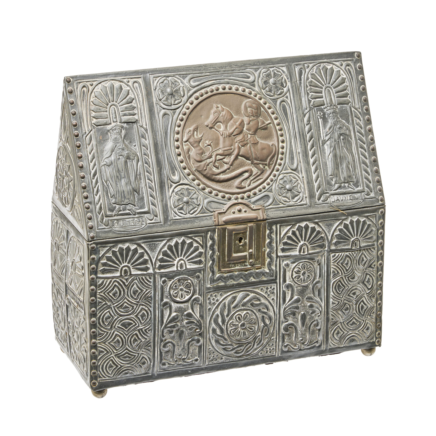 Arquilla en estaño de estilo renacentista con la figura de San Jorge flanqueado por Guifré I de Barcelona y Jaime I con blasón de Cataluña en el reverso, primera mitad del s.XX. Adjunta llave.
