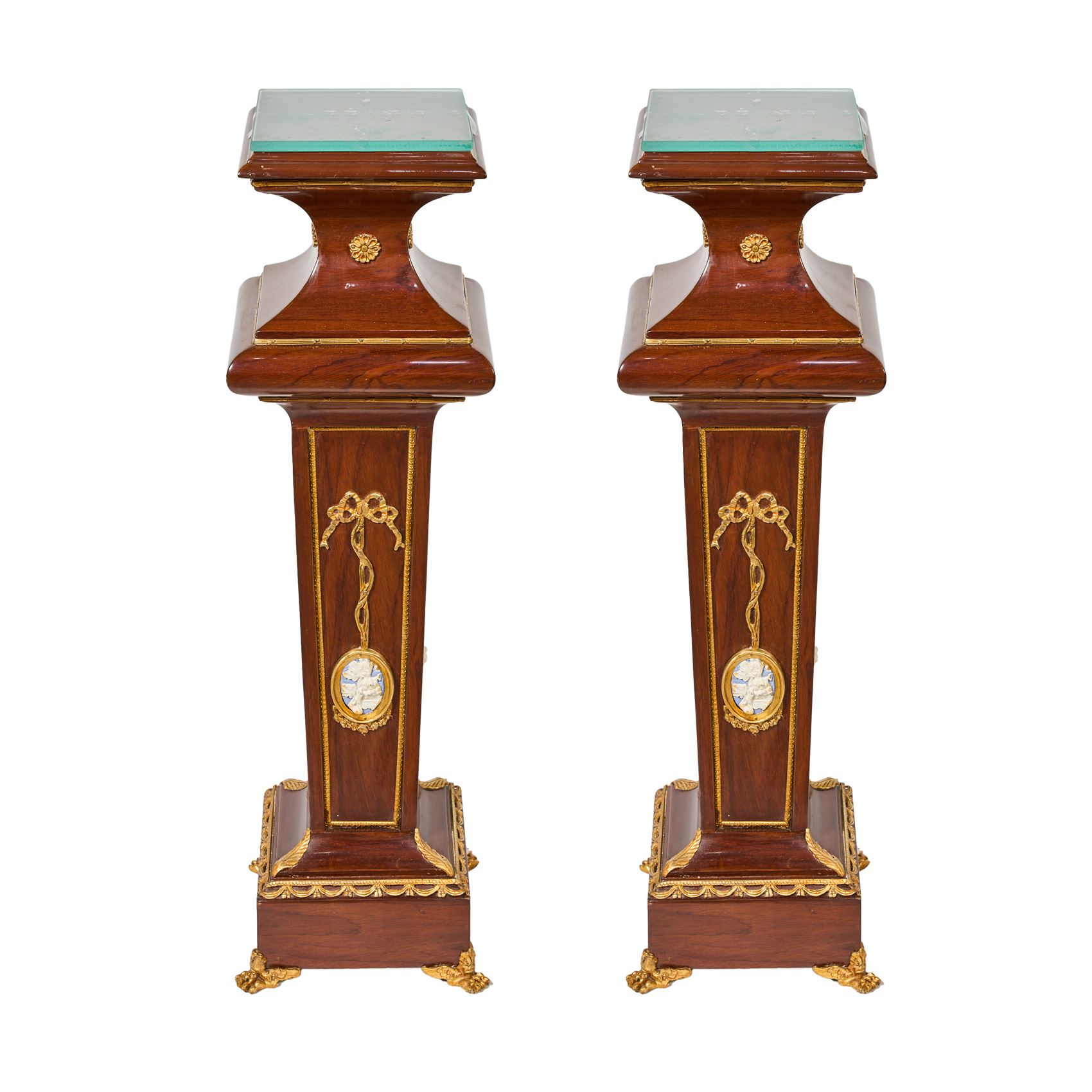 Pareja de pedestales estilo Luis XVI en madera con aplicaciones en bronce dorado y medallón central con relieve floral, s.XX. Presenta sobre en cristal.