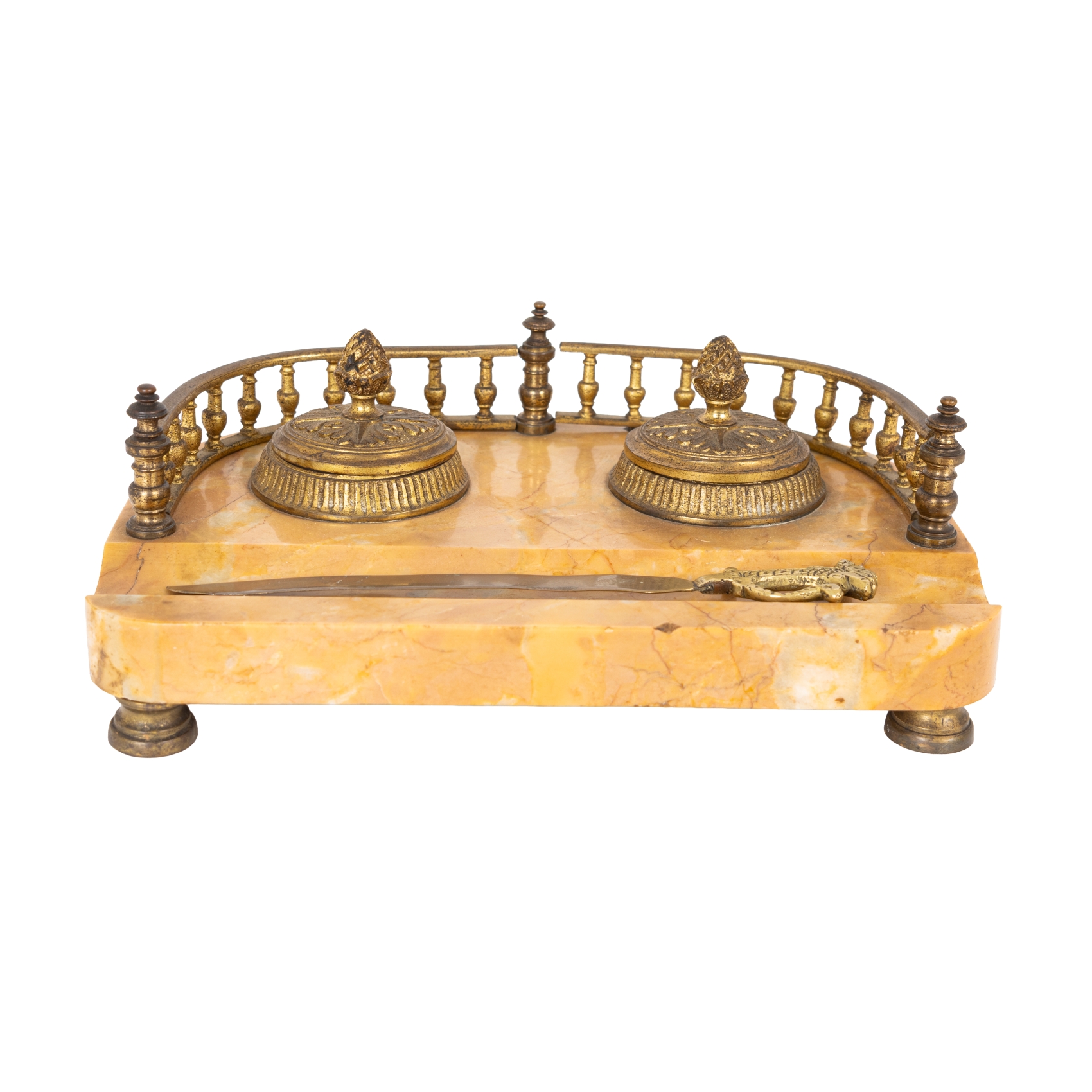 Escribanía de dos tinteros en ónix con decoraciones en bronce dorado, s.XX. Adjunta abrecartas en metal dorado con forma de sable.
