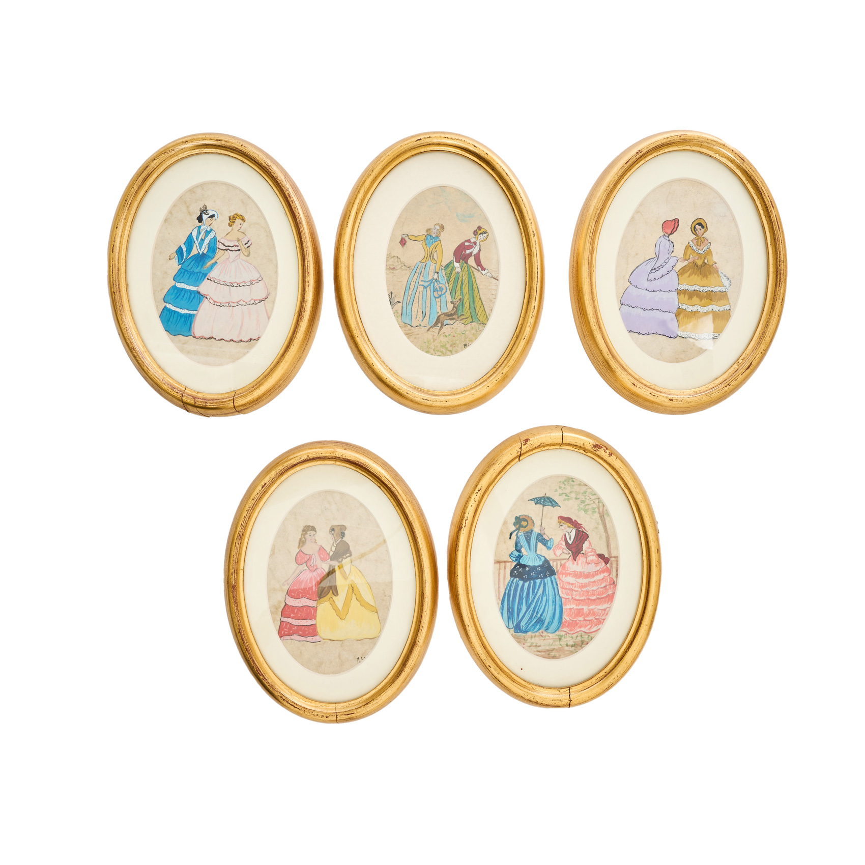 Lote de cinco miniaturas pintadas al gouache sobre papel con representaciones de damas dieciochescas, s.XX. Enmarcadas.