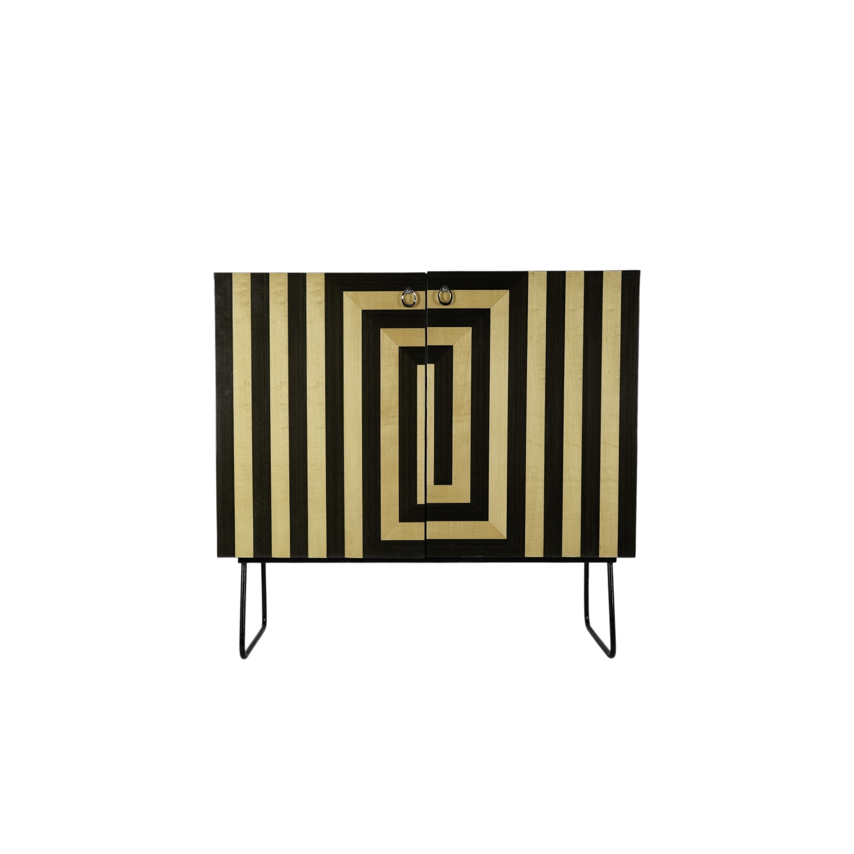 Aparador estilo Mid Century en maderas contrastadas chapadas con motivos lineales bicolor y dos puertas batientes con patas en metal, s.XX.