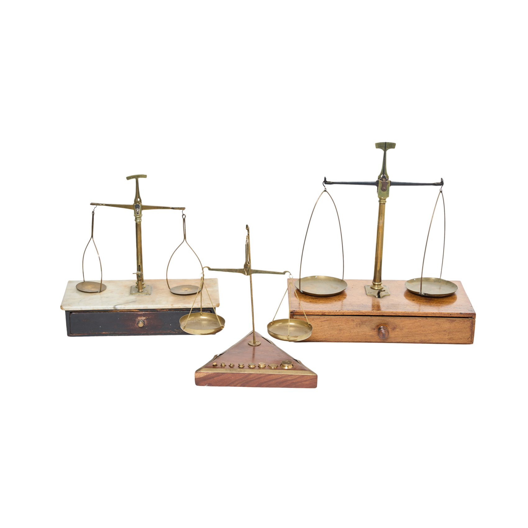 Lote de tres balanzas de precisión para farmacia en latón dorado sobre bases en madera y mármol, s.XX. Adjuntan pesas. Una con estuche.