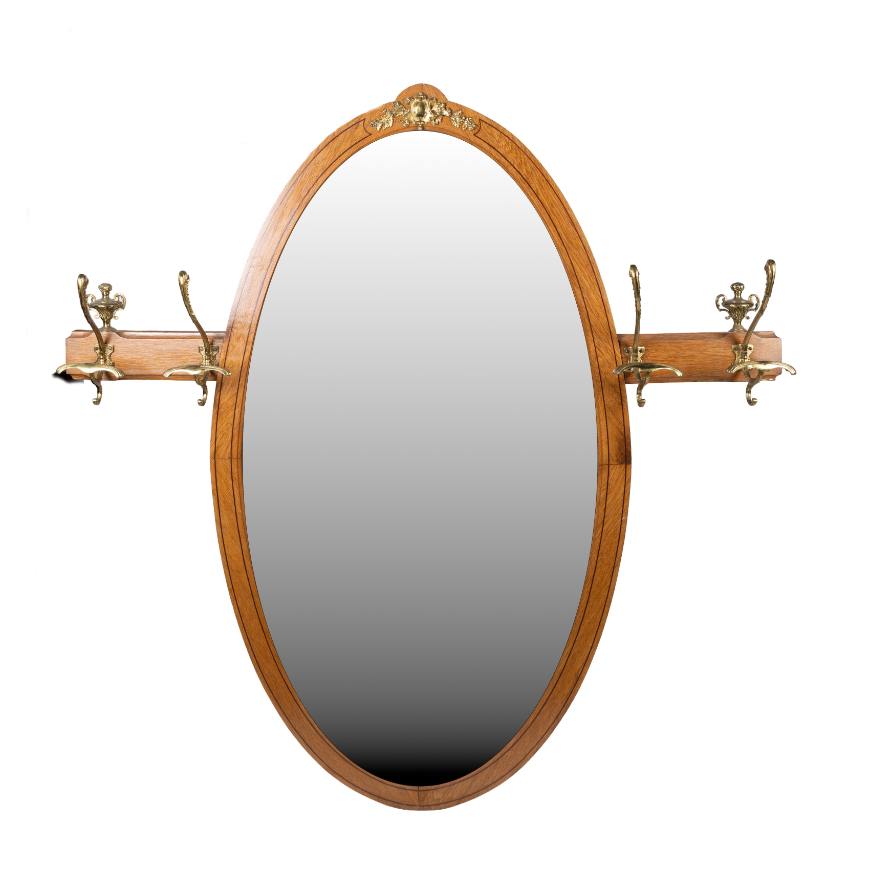 Espejo noucentista ovalado de recibidor en madera tallada con colgadores, decoración de copas y vegetales en latón, c.1920.
