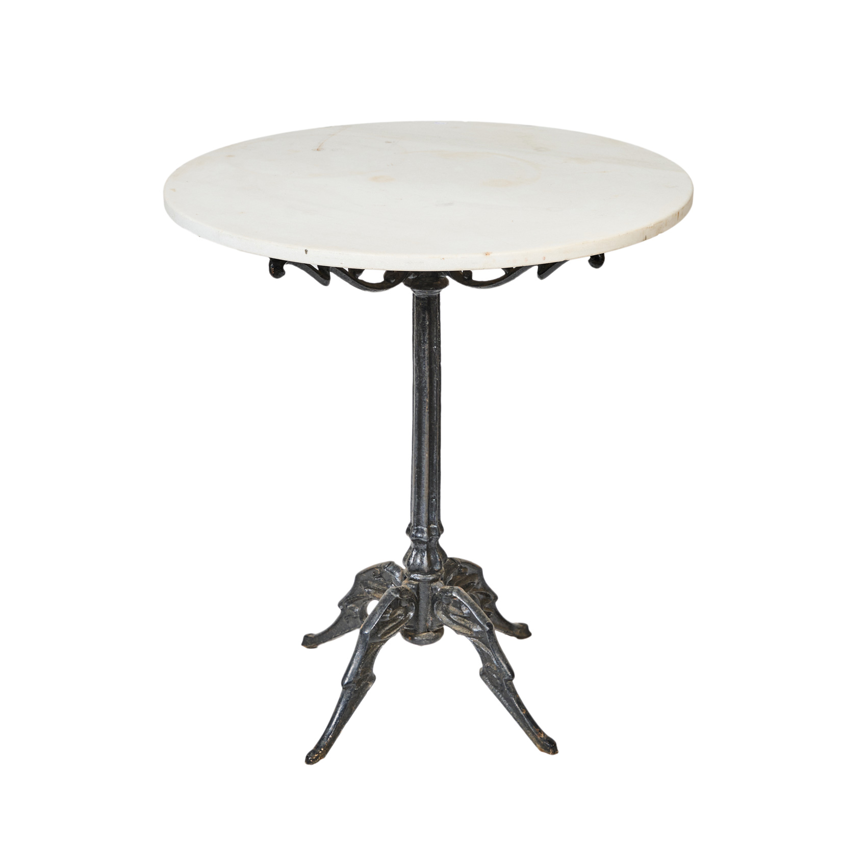 Mesa circular con pie de forja y sobre en mármol blanco, s.XX.