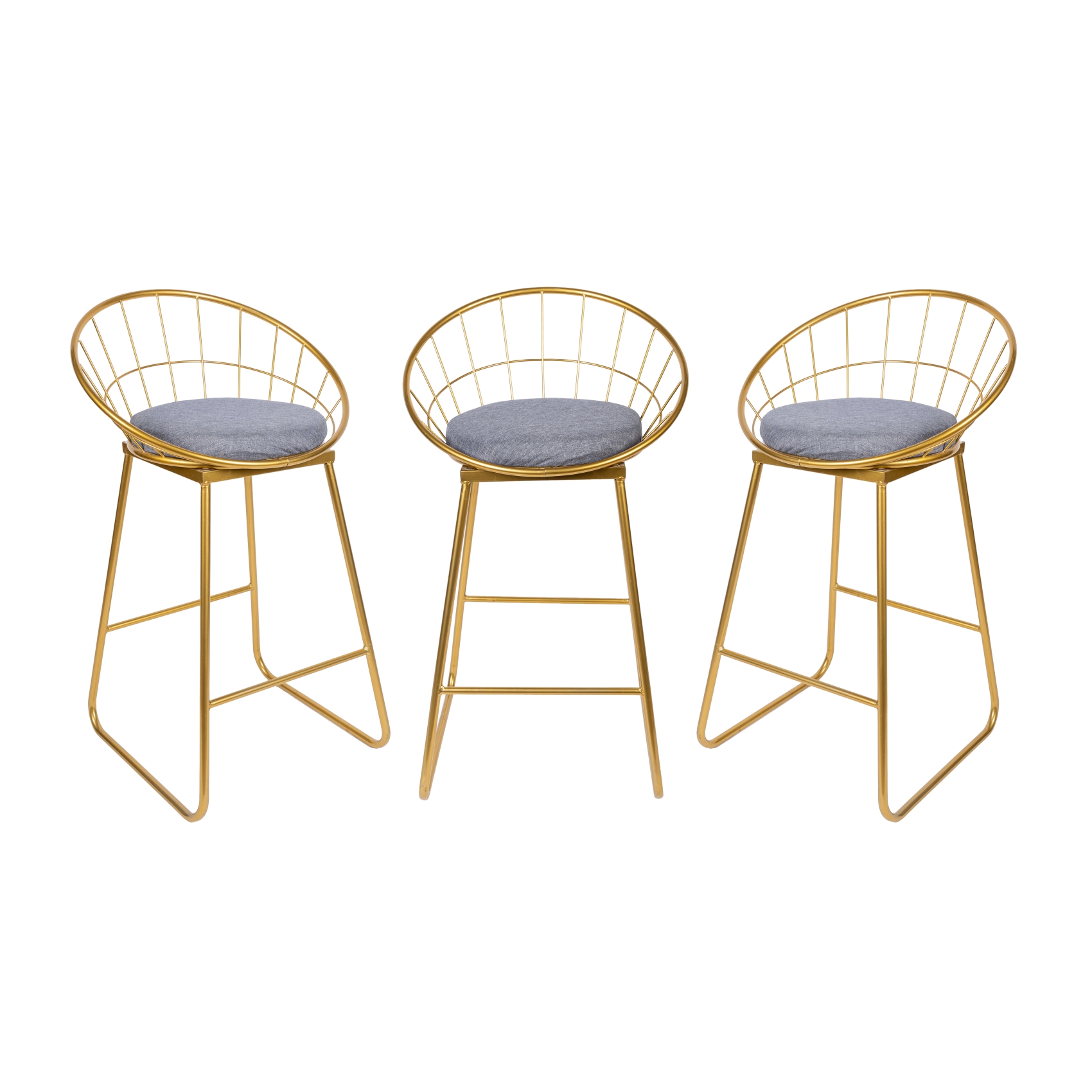 Juego de tres taburetes de barra en metal lacado en dorado y cojines de tapicería en tonalidad gris.