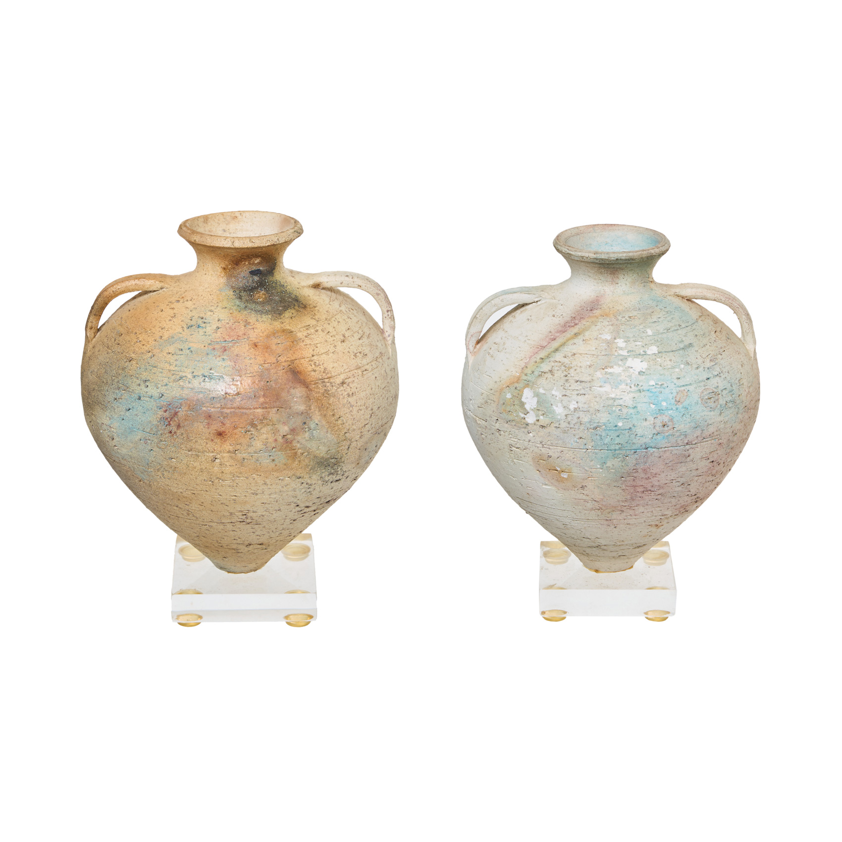 Pareja de jarrones decorativos en terracota policromada sobre pequeñas peanas en metacrilato, fles. del s.XX.
