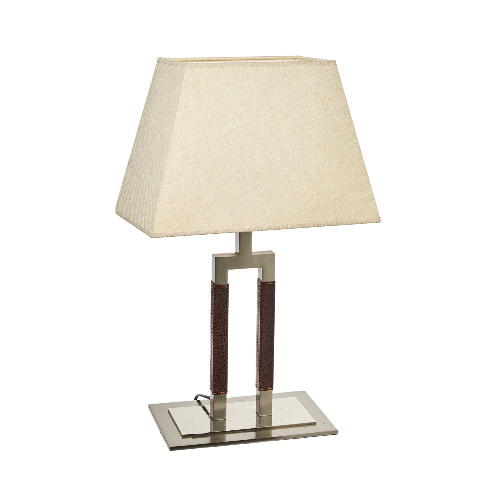 Lámpara de sobremesa con base geométrica en aluminio cromado y piel de tonalidad marrón, s.XX. Pantalla en tela beige.