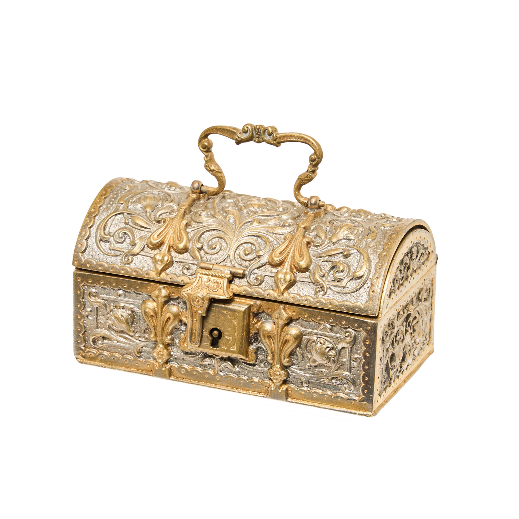 Pequeño cofre modernista en bronce dorado parcialmente plateado con decoraciones de motivos florales, ppios. del s.XX. Adjunta llave.