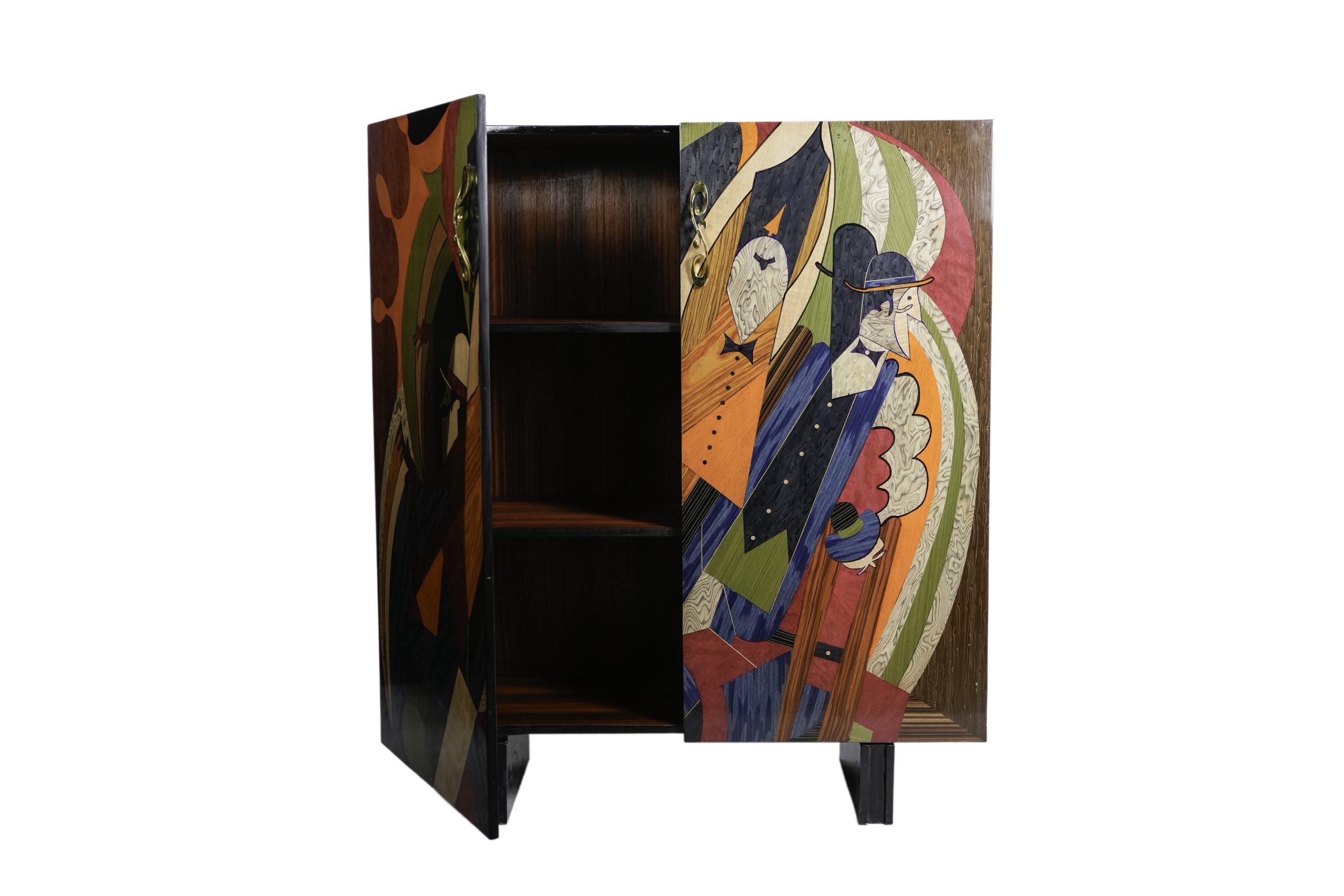 Aparador estilo Mid Century realizado en madera chapada con marquetería en diferentes tonos con motivos de personajes al frente, s.XX. Presenta doble puerta y blada inferior.