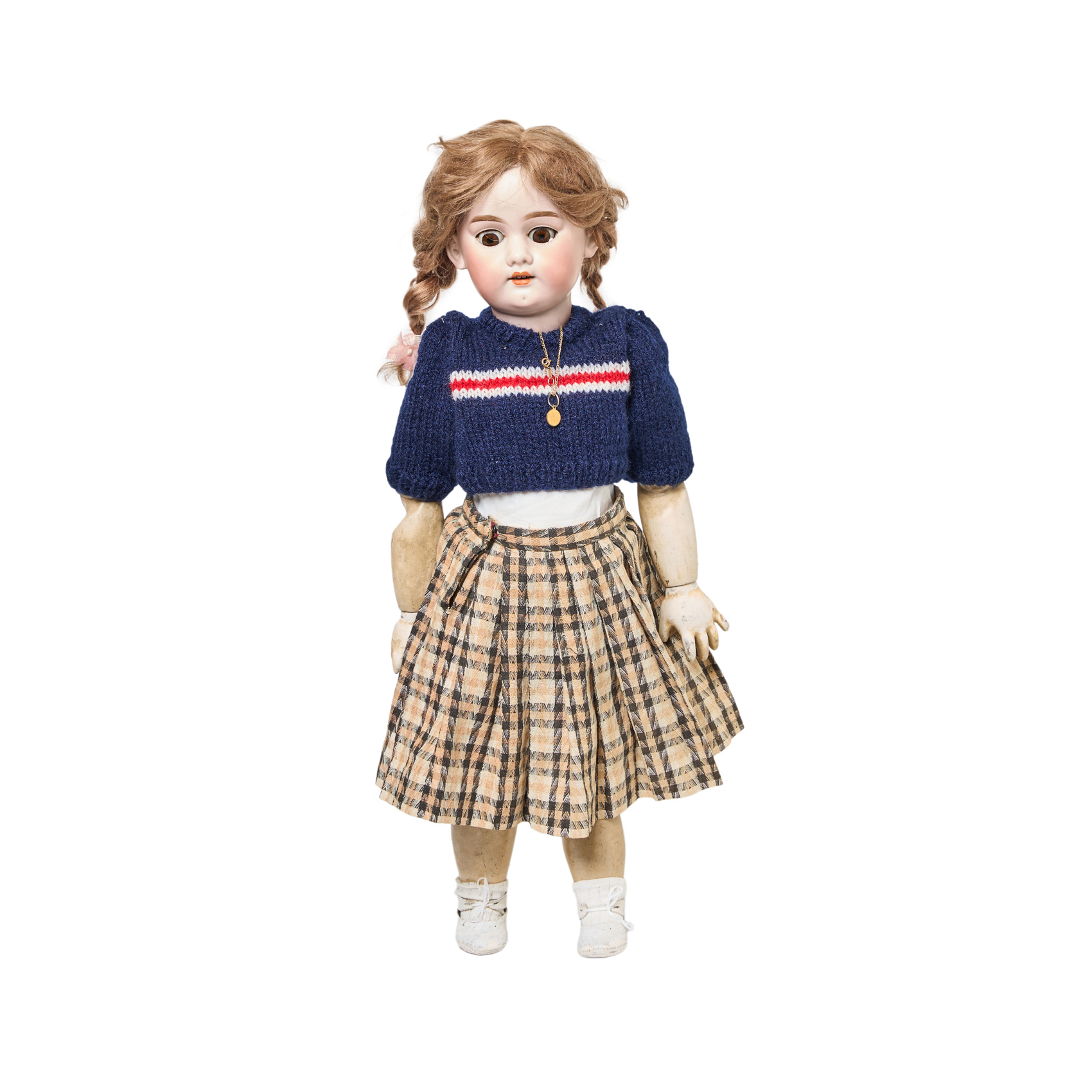 Muñeca en pocelana alemana con cabeza en buscuit y cuerpo en madera tallada. Ojos durmientes en cristal. Presenta marcas en la nuca.