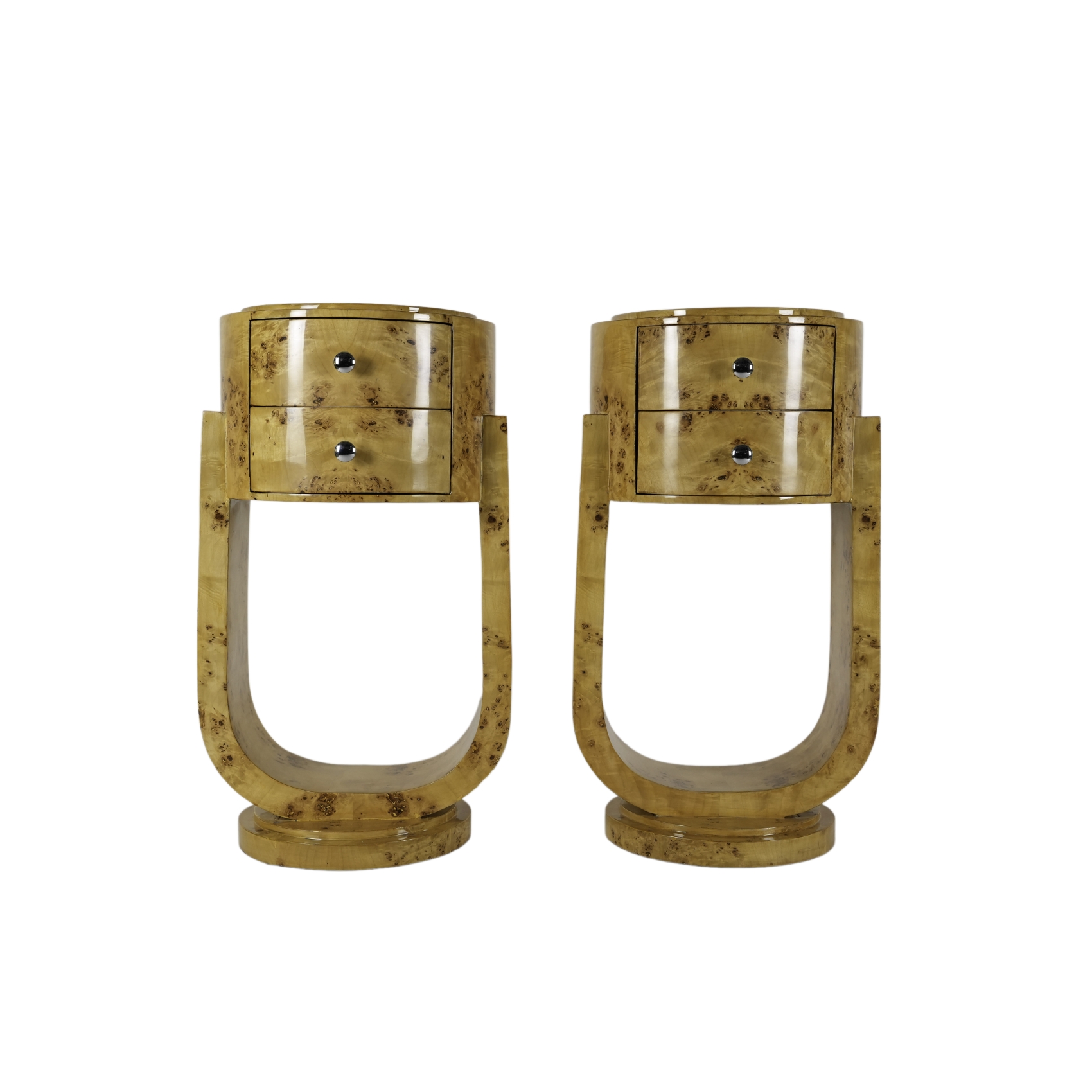 Pareja de mesitas de noche en madera chapada con pies en forma de «U» y dos cajones al frente, s.XX.