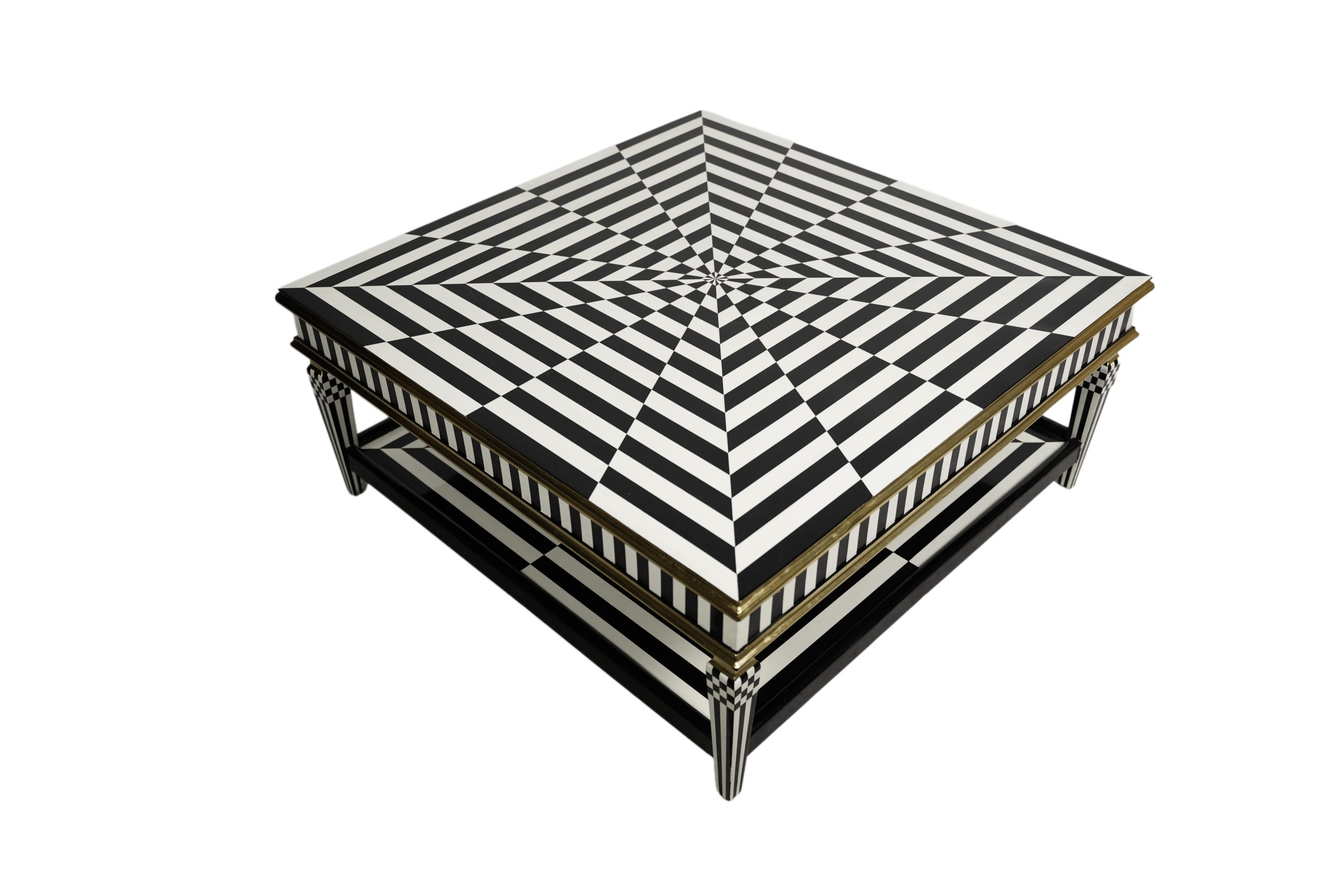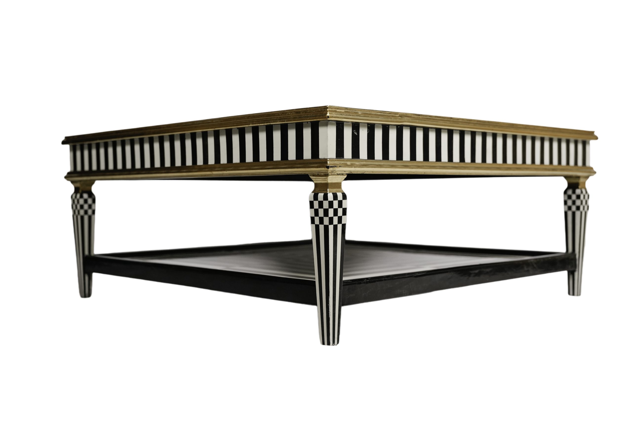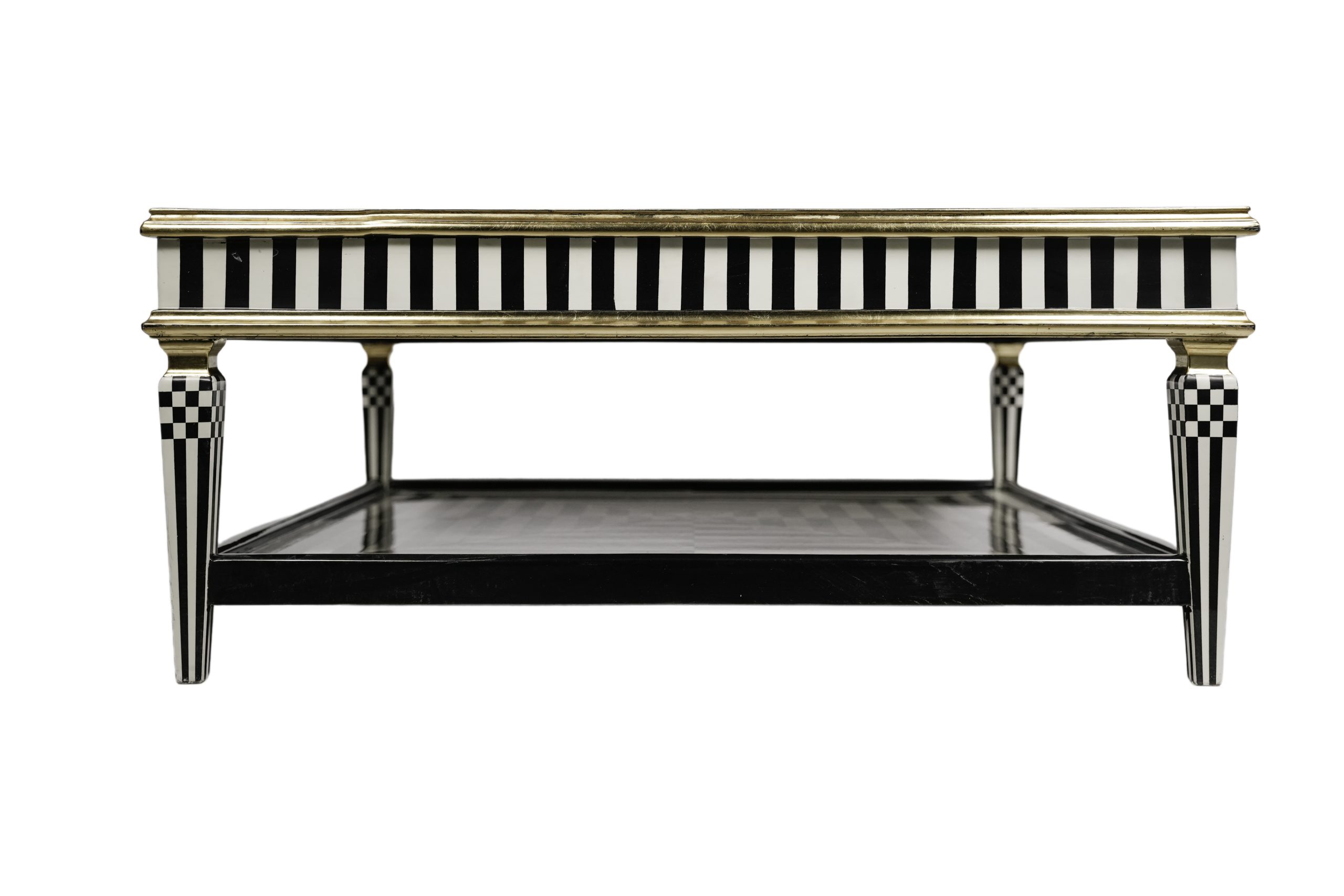 Mesa de centro en madera bicolor blanca y negra con motivo decorativo geométrico y parcialmente dorada, s.XX.