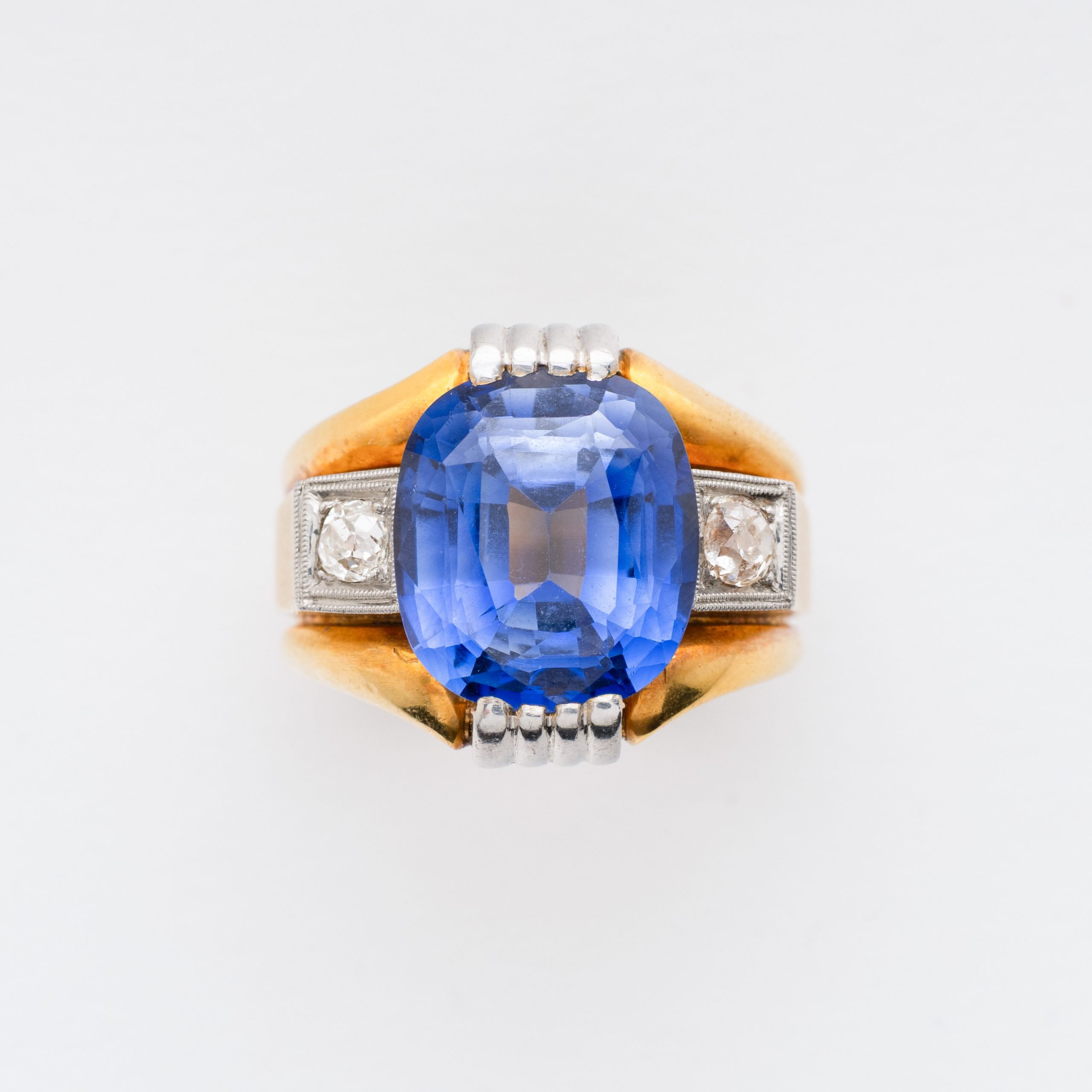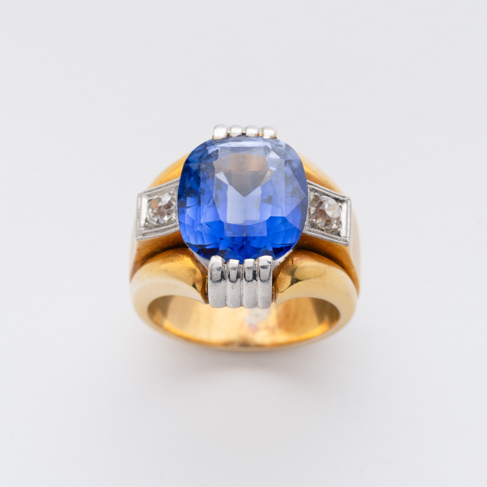 Sortija de oro y platino con zafiro talla cojín y custodiado por diamantes talla antigua.
