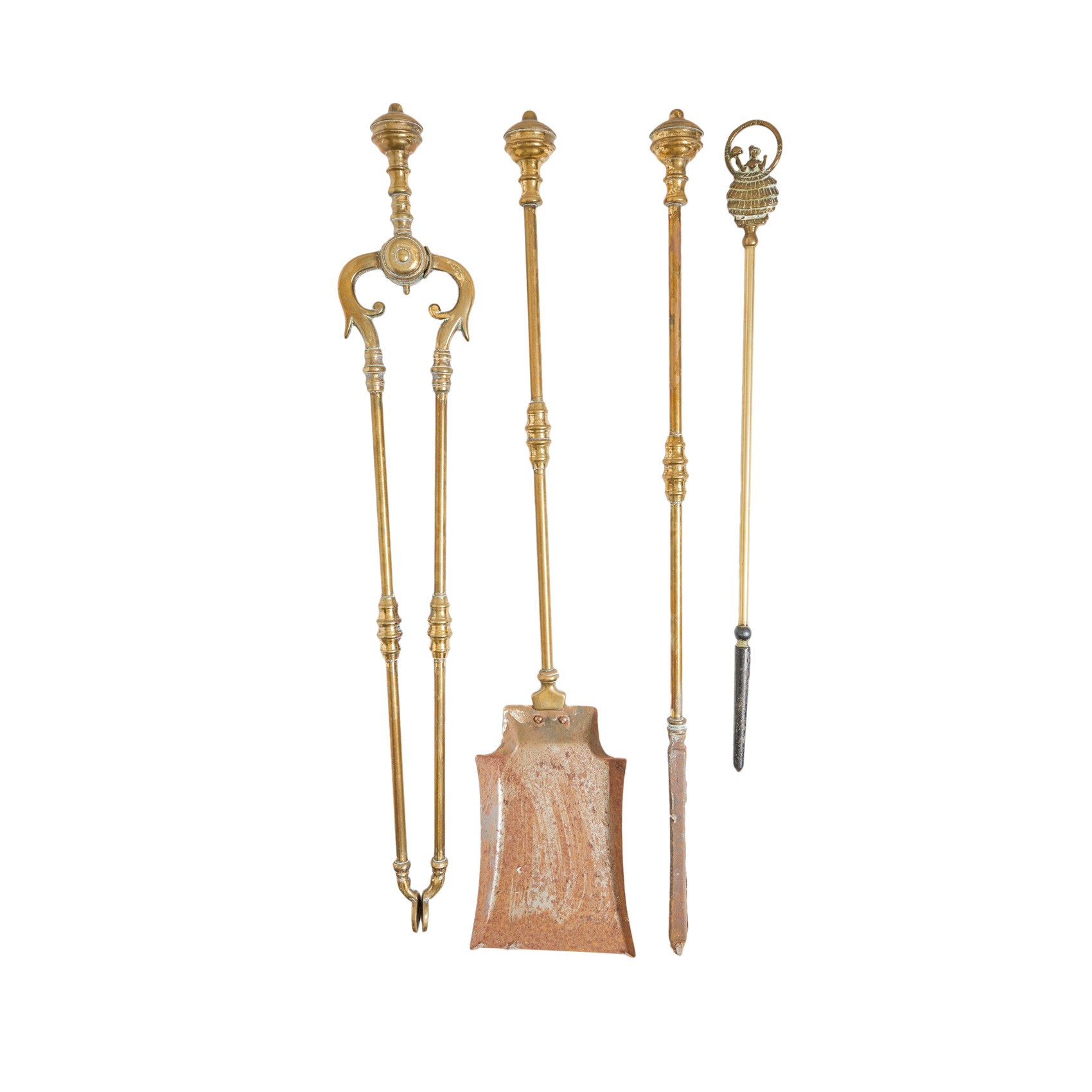 Lote de cuatro utensilios de chimenea en bronce dorado y hierro, s.XX. Compuesto por dos atizzadores, una pala y unas pinzas.