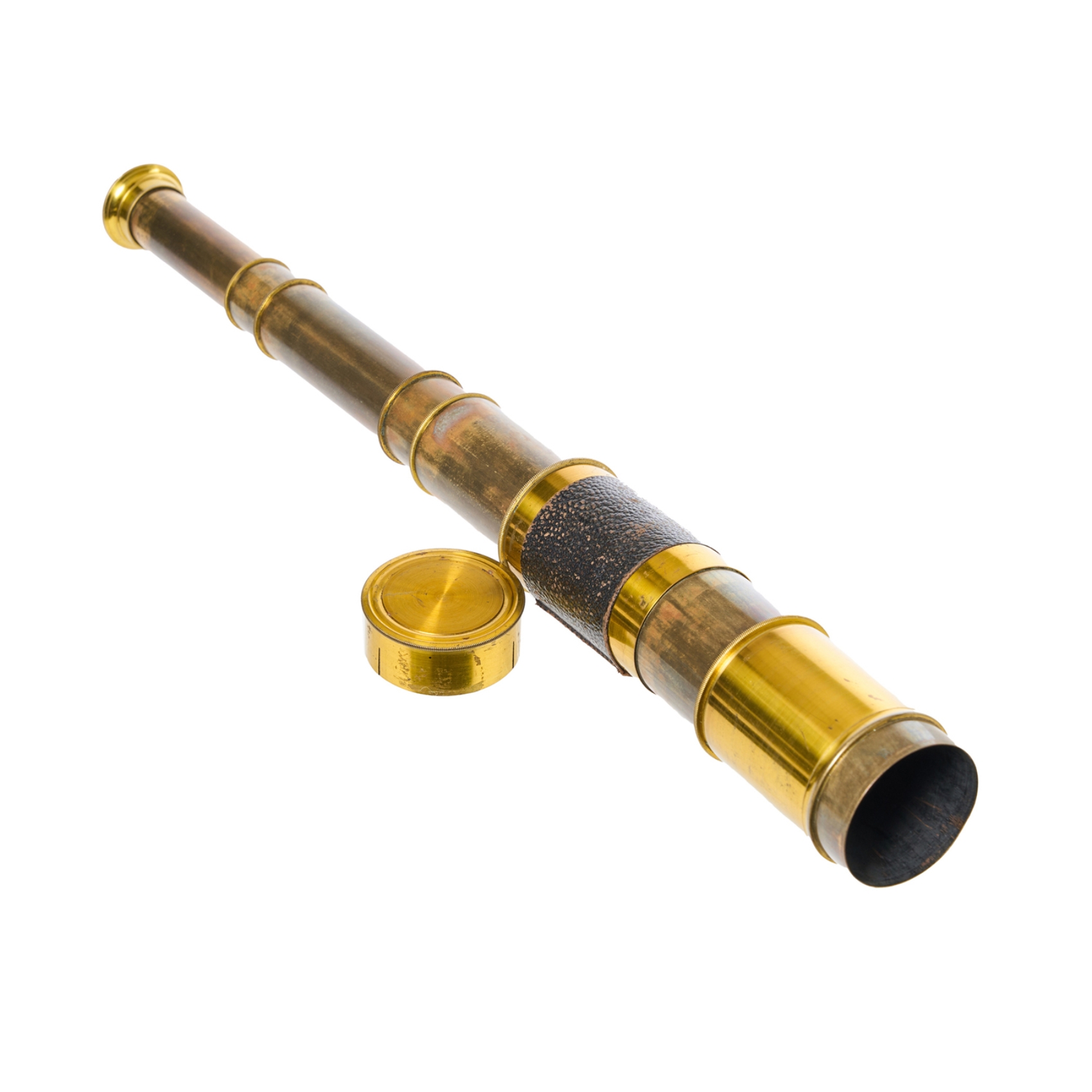 Catalejo francés de la manufactura Armes & Cycles, St. Etienne, en bronce dorado y cuero marrón, fles. del s.XIX.