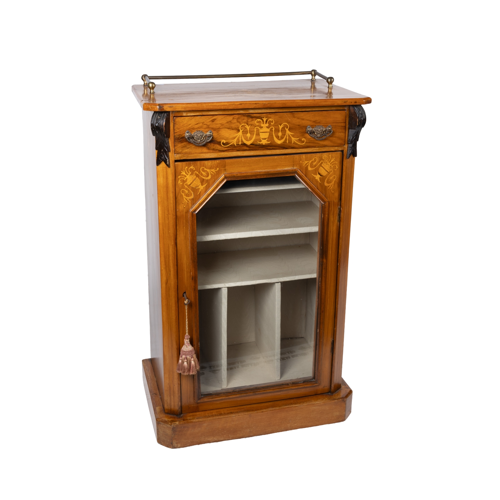 Vitirna expositora en madera de roble con marqueterías en boj, fles. del s.XIX-ppios. del s.XX. Puerta frontal acristalada con interior compartimentado e iluminado. Un cajón superior. Coronado por barandilla en metal. Adjunta llave.