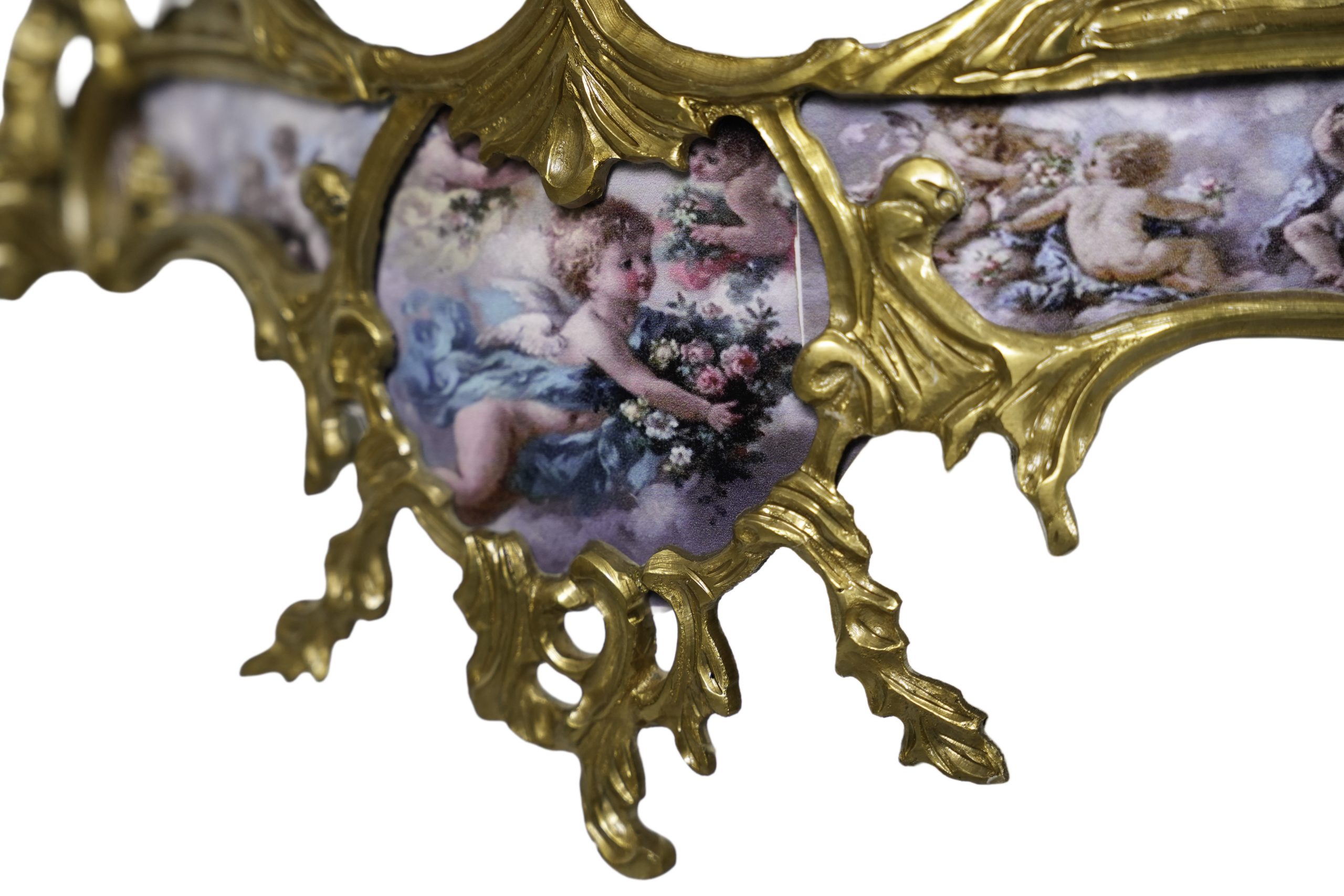 Velador en bronce dorado estilo Luis XVI con placas en porcelana esmaltada y base en mármol blanco, s.XX.