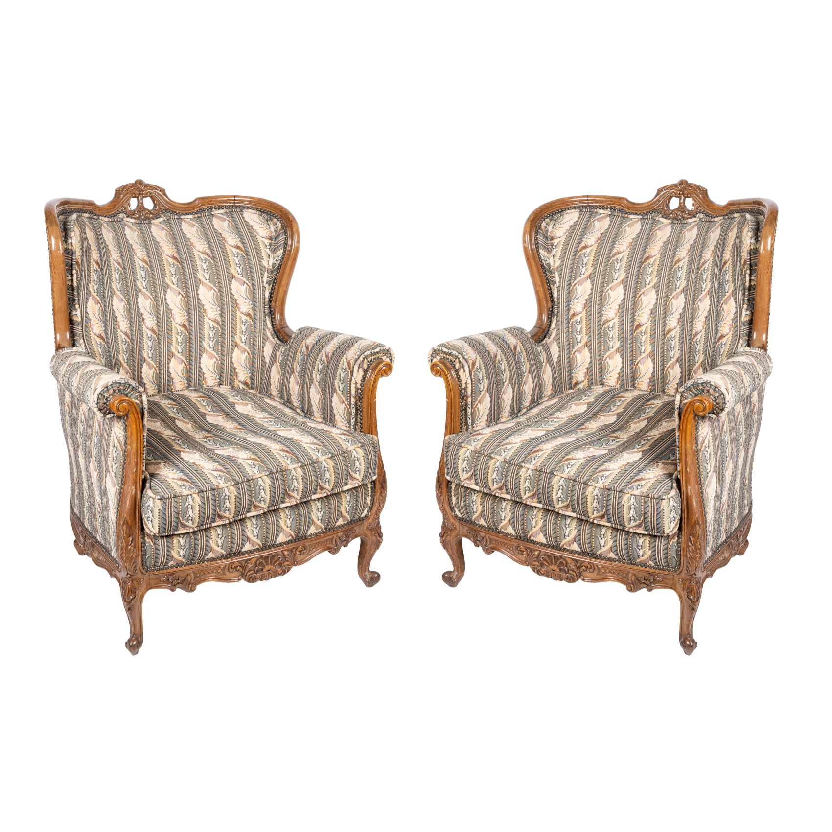 Pareja de sofás estilo Luis XV en madera tallada y tapicería con decoración de motivos florales y vegetales, s.XX.