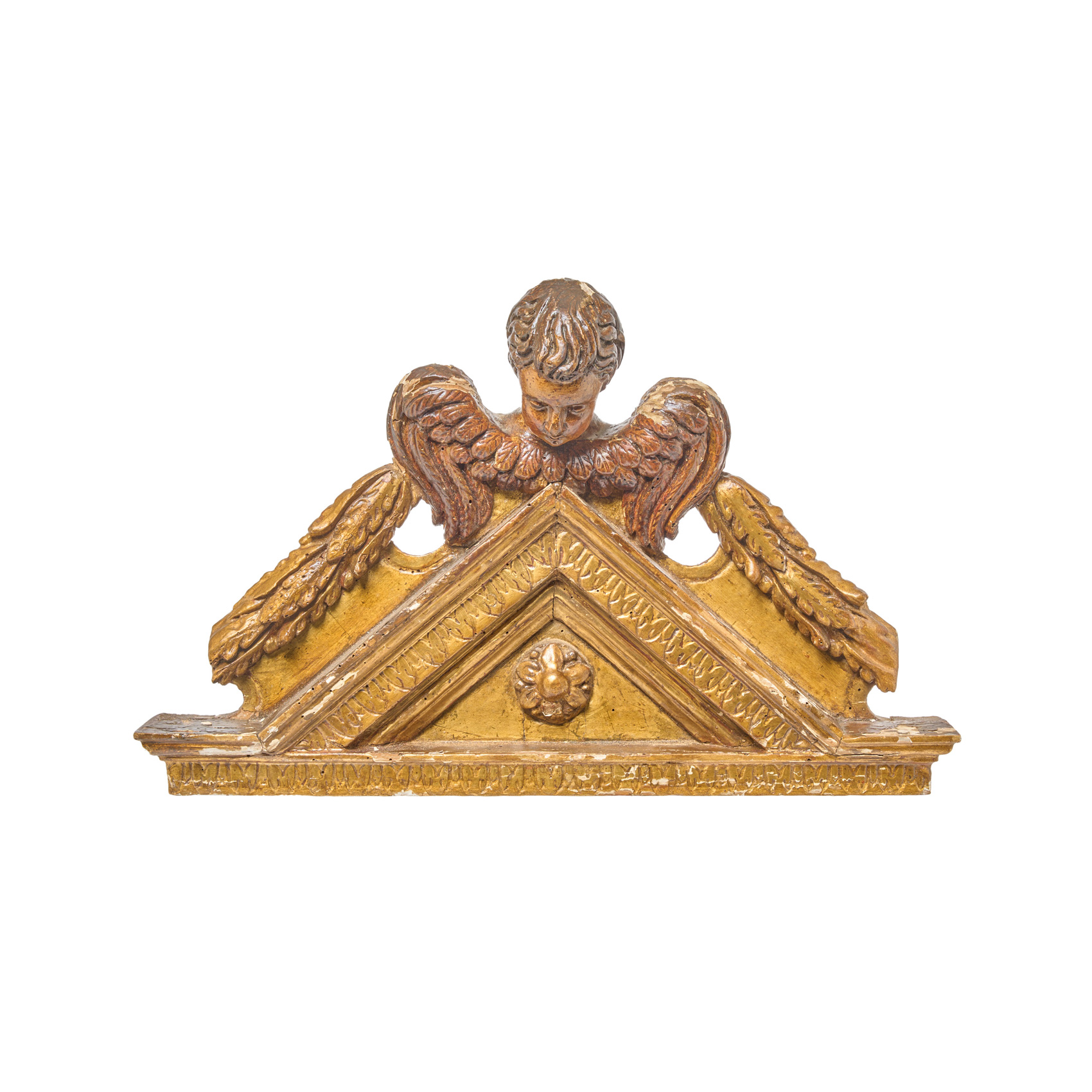 Remate o frontón en madera tallada, estucada y dorada con testa de querubín en relieve, segunda mitad del s.XVIII.