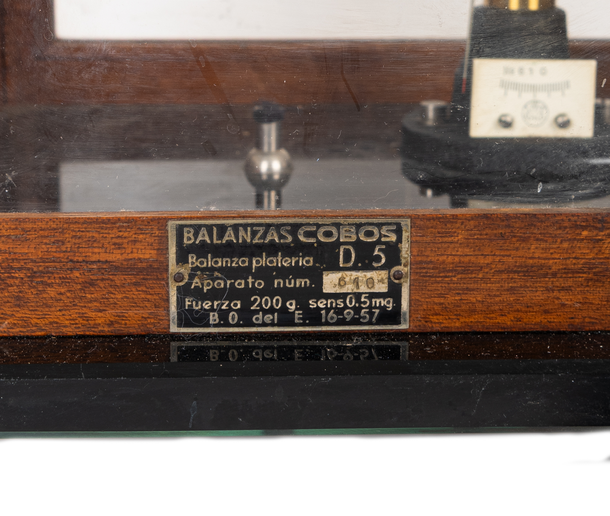 Antigua balanza de precisión de «Balanzas Cobos» para uso de farmacia o laboratorio, c.1957. Custodiada en urna regulable en madera y cristal.
