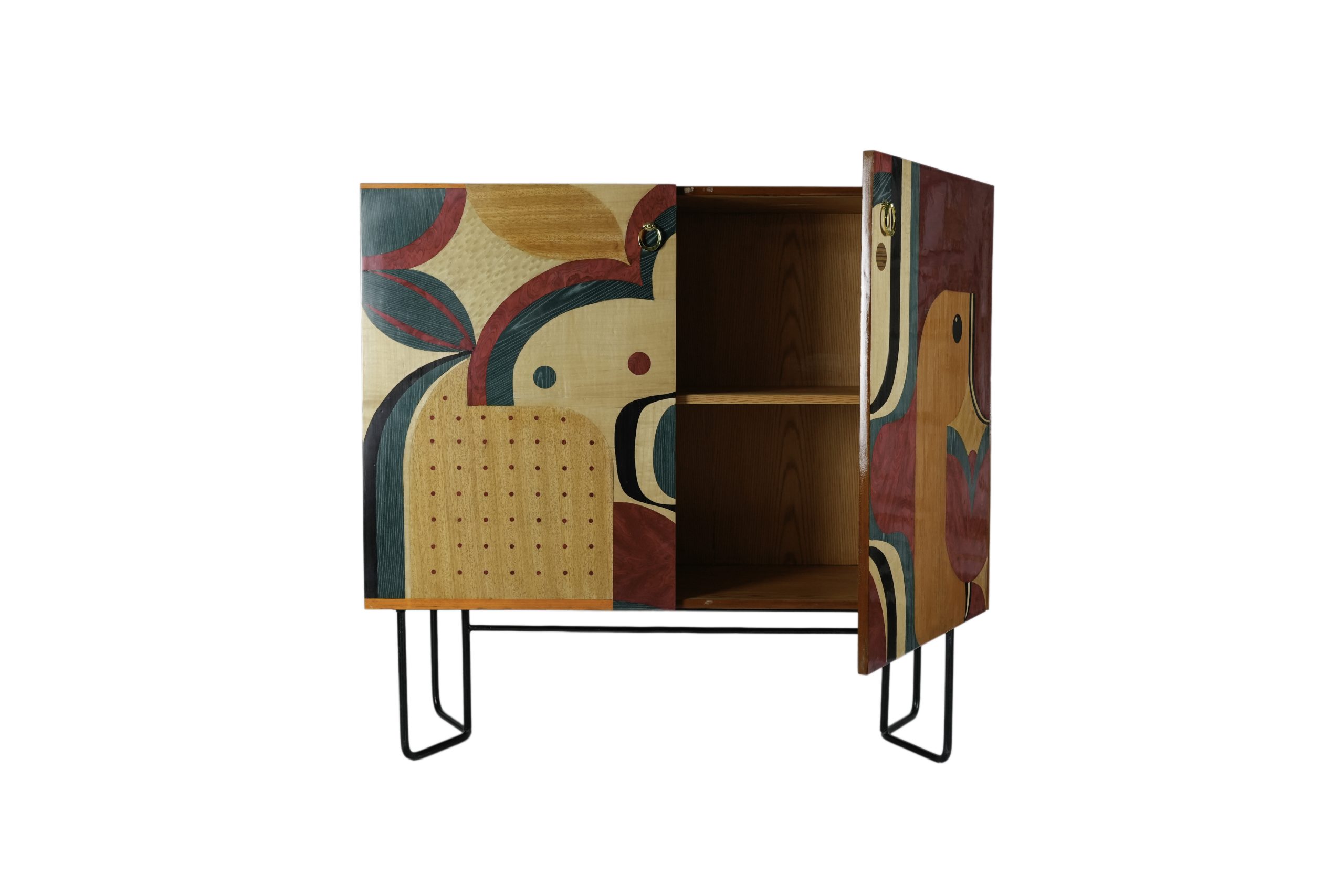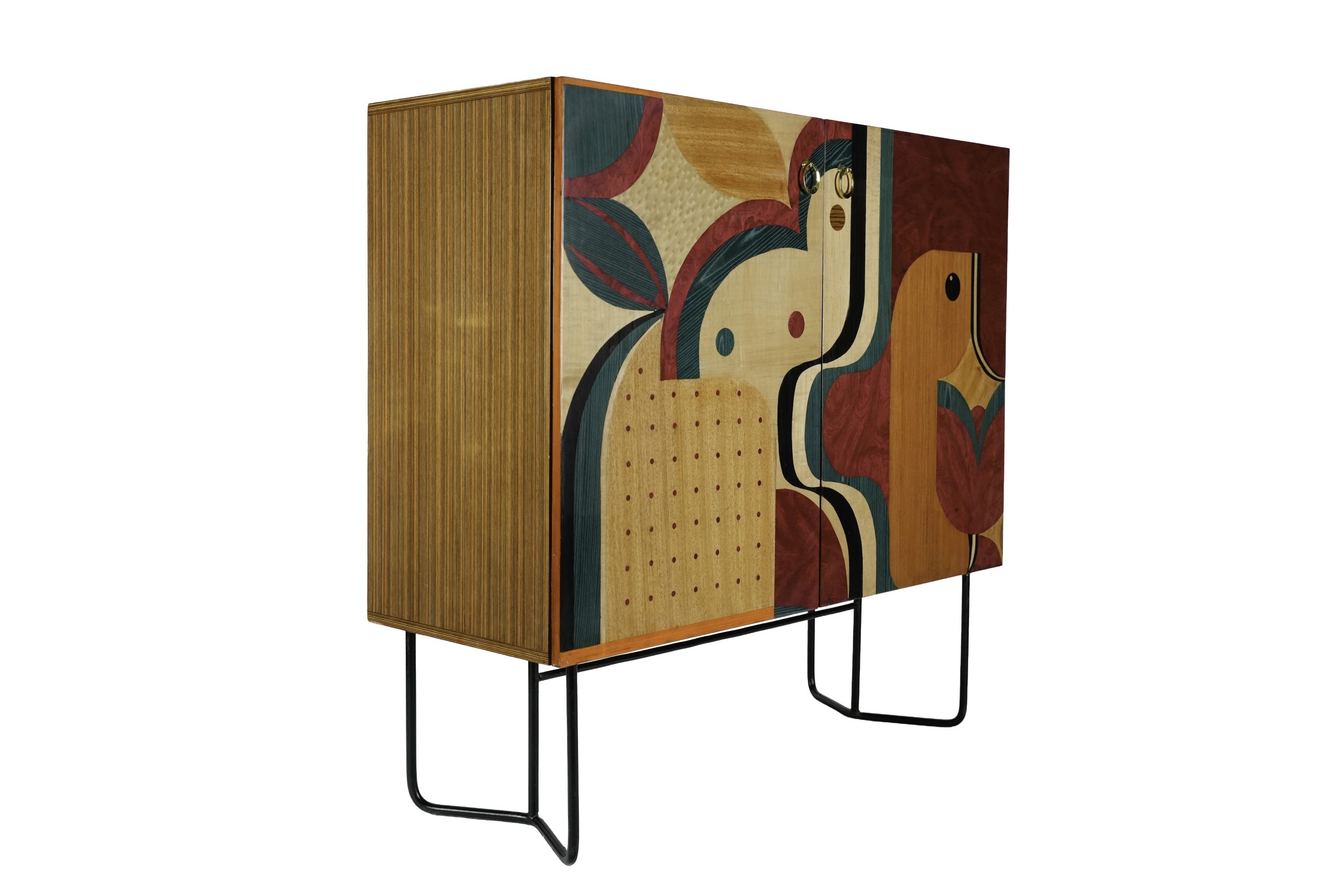 Aparador en maderas contrastadas chapadas en con motivos geométricos y dos puertas batientes con patas en metal, s.XX.