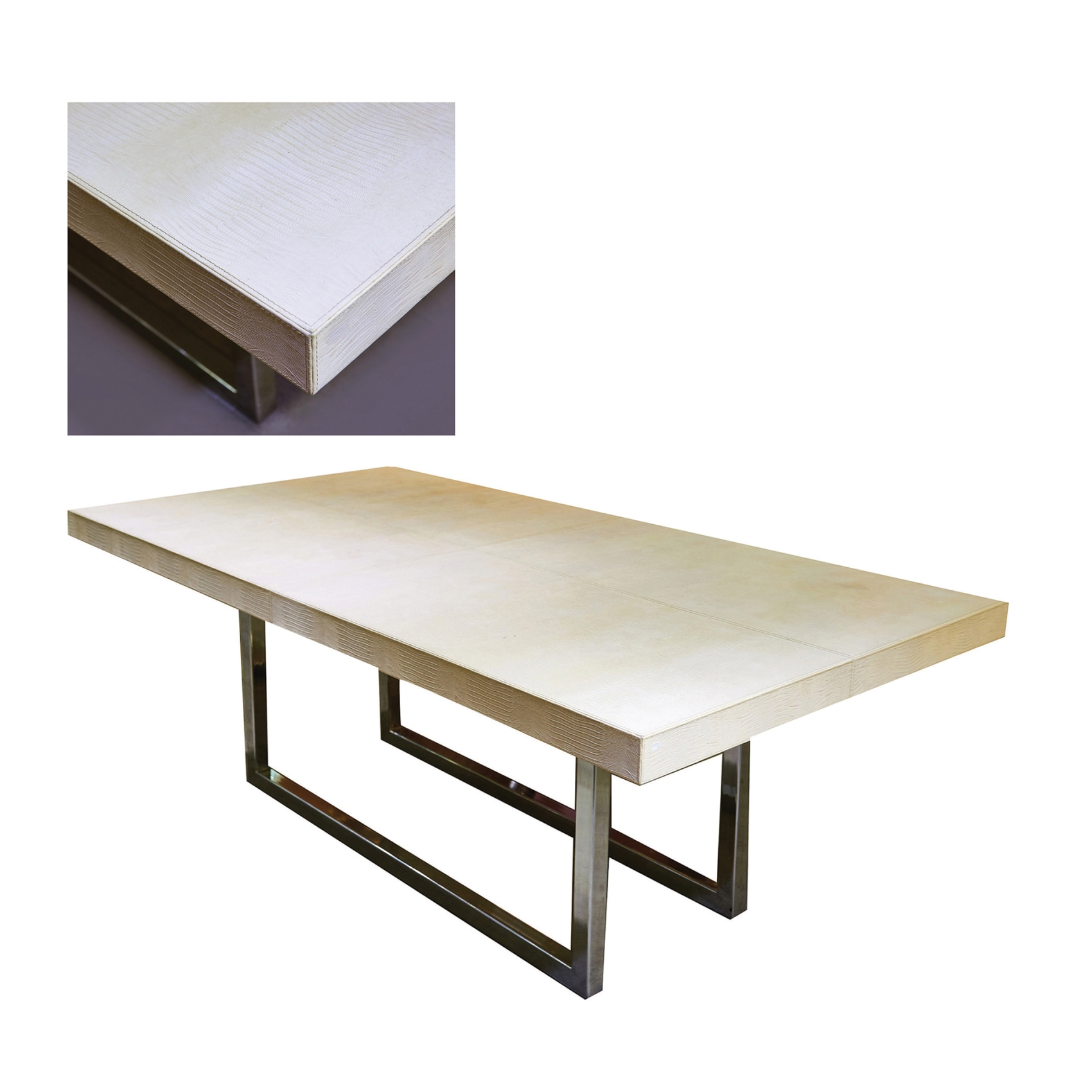 Mesa de comedor con patas en acero y tapicería en piel blanca, segunda mitad del s.XX.