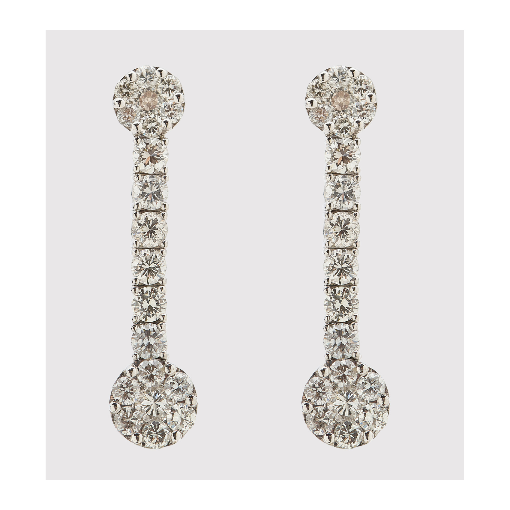 Pendientes largos en oro blanco con dos rosetones y barrita de diamantes talla brillante.