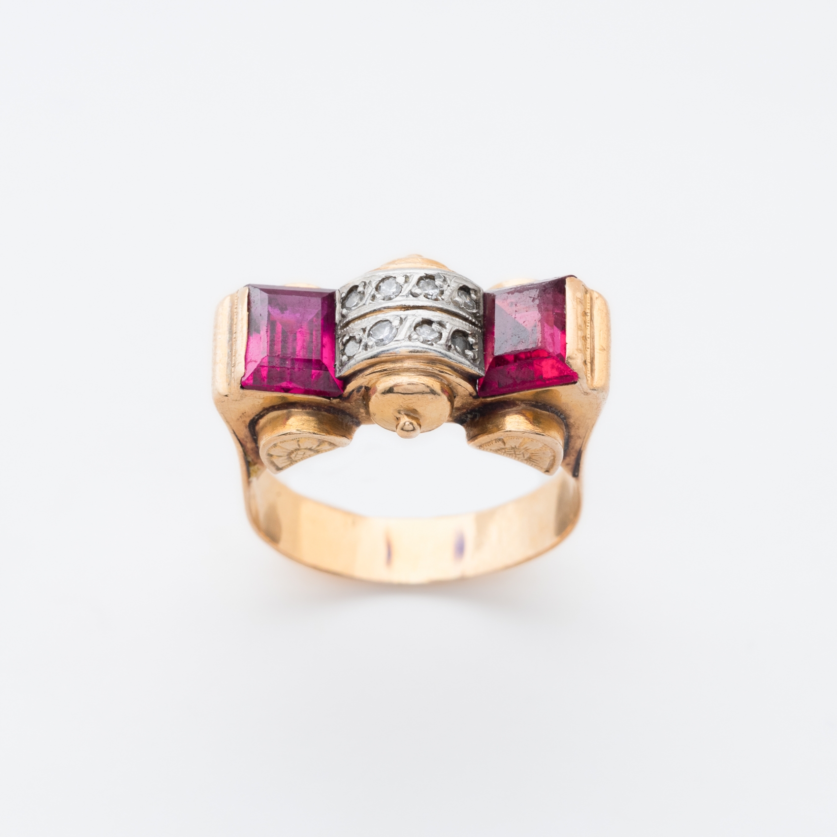 Sortija Chevalier en oro y vistas en platino con símiles de rubí de 7 x 5 mm. y diamantes talla 8/8, c.1930.