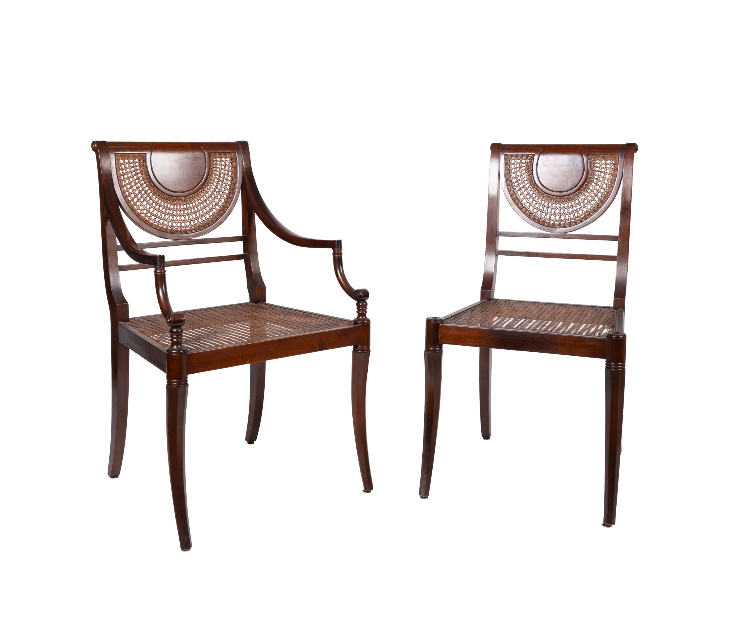 Juego de seis sillas y dos sillones estilo Regency en madera de cerezo tallada con asiento y respaldo en rejilla de mimbre natural, s.XX.